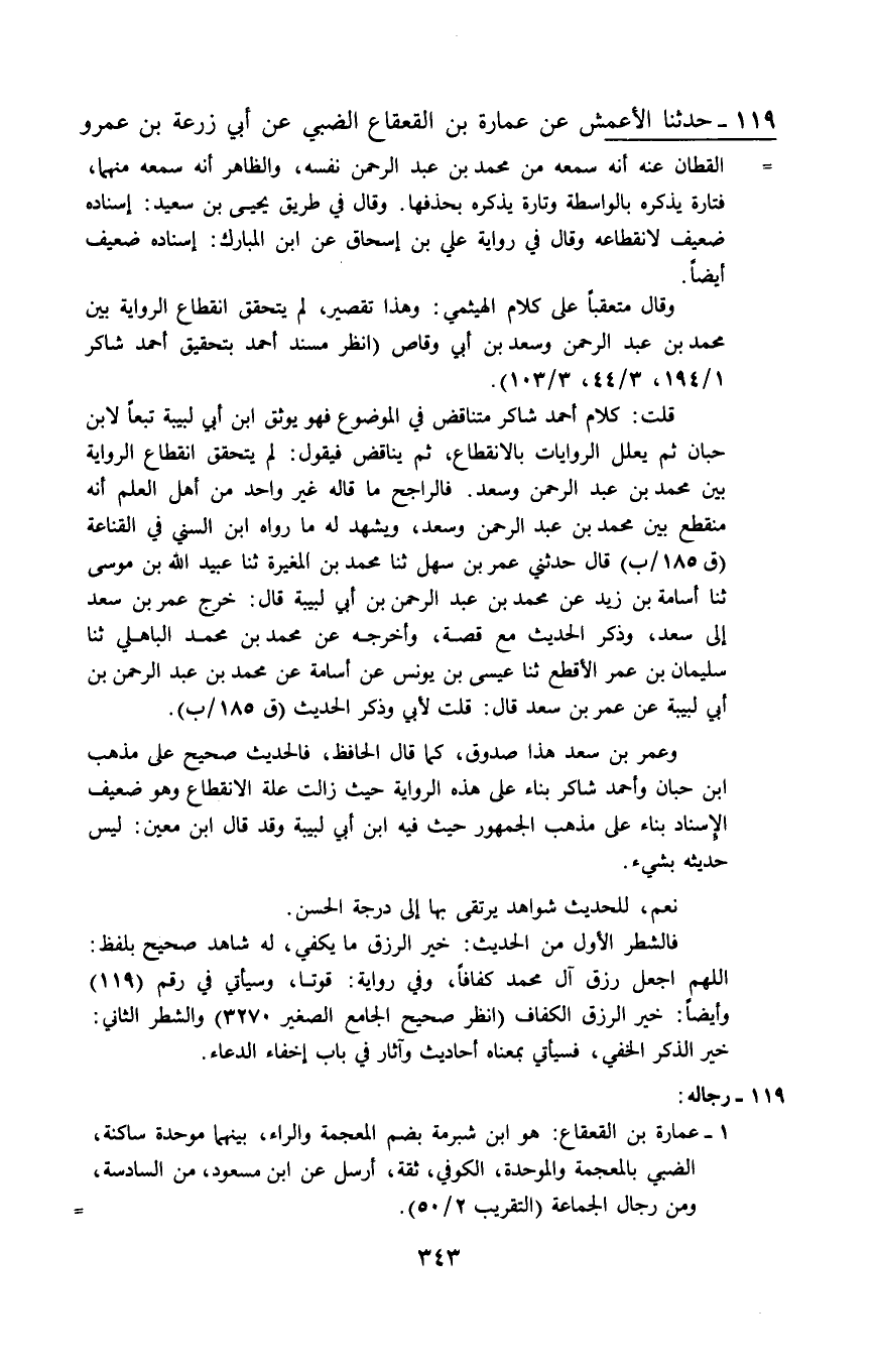119 - حَدَّثَنَا الْأَعْمَشُ، عَنْ عُمَارَةَ بْنِ الْقَعْقَاعِ الضَّبِّيِّ، عَنْ أَبِي زُرْعَةَ بْنِ عَمْرِو -[344]- بْنِ جَرِيرٍ، عَنْ أَبِي هُرَيْرَةَ قَالَ: قَالَ رَسُولُ اللَّهِ صَلَّى اللهُ عَلَيْهِ وَسَلَّمَ: «§اللَّهُمَّ اجْعَلْ رِزْقَ آلِ مُحَمَّدٍ قُوتًا»