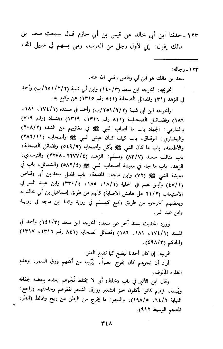123 - حَدَّثَنَا ابْنُ أَبِي خَالِدٍ، عَنْ قَيْسِ بْنِ أَبِي حَازِمٍ، قَالَ: سَمِعْتُ سَعْدَ بْنَ مَالِكٍ يَقُولُ: §إِنِّي لَأَوَّلُ رَجُلٍ مِنَ الْعَرَبِ رَمَى بِسَهْمٍ فِي سَبِيلِ اللَّهِ، -[349]- وَلَقَدْ رَأَيْتُنَا مَعَ رَسُولِ اللَّهِ صَلَّى اللهُ عَلَيْهِ وَسَلَّمَ، وَمَا لَنَا طَعَامٌ إِلَّا السَّمُرُ، وَوَرَقُ الْحُبْلَةِ، حَتَّى إِنْ كَانَ أَحَدُنَا لَيَضَعُ كَمَا تَضَعُ الْعَنْزُ، مَا لَهُ خِلْطٌ