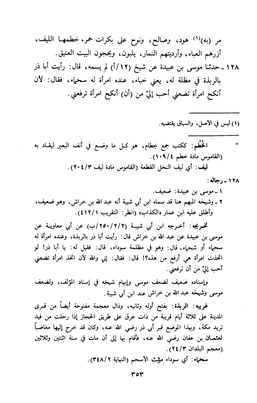 128 - حَدَّثَنَا مُوسَى بْنُ عُبَيْدَةَ، عَنْ شَيْخٍ لَمْ يُسَمِّهِ، قَالَ: رَأَيْتُ أَبَا ذَرٍّ بِالرَّبَذَةِ فِي مَظَلَّةٍ لَهُ، يَعْنِي خِبَاءً، عِنْدَهُ امْرَأَةٌ لَهُ سَحْمَاءُ، فَقَالَ: §لَأَنْ أَنْكِحَ امْرَأَةً تَضَعُنِي أَحَبُّ إِلَيَّ مِنْ أَنْ أَنْكِحَ امْرَأَةً تَرْفَعُنِي "