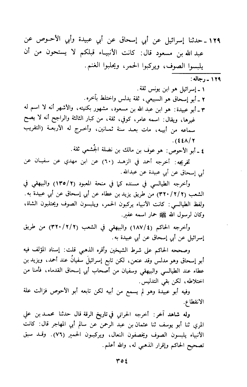 129 - حَدَّثَنَا إِسْرَائِيلُ، عَنْ أَبِي إِسْحَاقَ، عَنْ أَبِي عُبَيْدَةَ، وَأَبِي الْأَحْوَصِ، عَنْ عَبْدِ اللَّهِ بْنِ مَسْعُودٍ، قَالَ: §كَانَتِ الْأَنْبِيَاءُ قَبْلَكُمْ لَا يَسْتَحُونَ مِنْ أَنْ يَلْبَسُوا الصُّوفَ، وَيَرْكَبُوا الْحُمُرَ، وَيَحْلِبُوا الْغَنَمَ