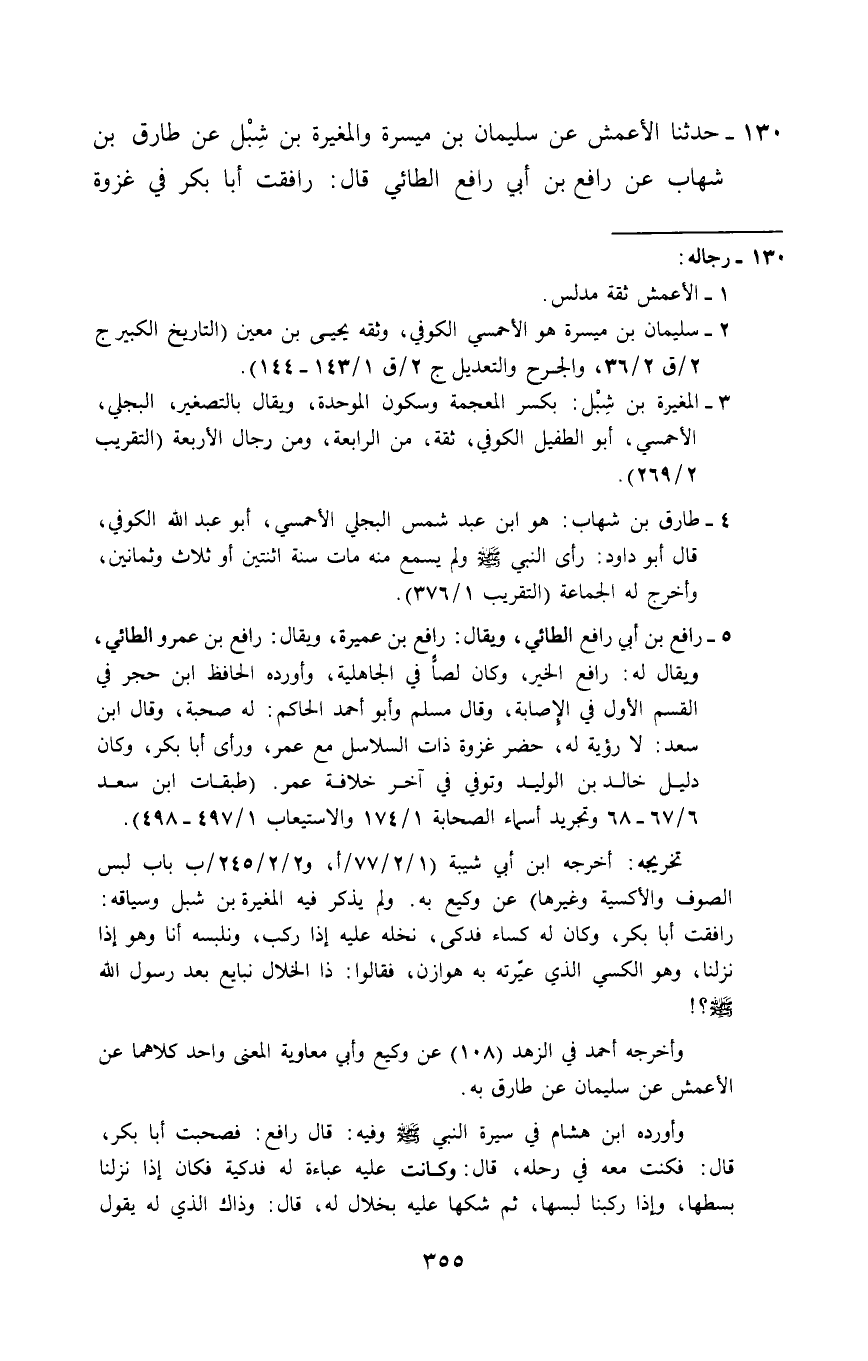 130 - حَدَّثَنَا الْأَعْمَشُ، عَنْ سُلَيْمَانَ بْنِ مَيْسَرَةَ، وَالْمُغِيرَةِ بْنِ شِبْلٍ، عَنْ طَارِقِ بْنِ شِهَابٍ، عَنْ رَافِعِ بْنِ أَبِي رَافِعٍ الطَّائِيِّ، قَالَ: §رَافَقْتُ أَبَا بَكْرٍ فِي غَزْوَةِ -[356]- ذَاتِ السَّلَاسِلِ، وَعَلَيْهِ كِسَاءٌ لَهُ، فَدَكِيٌّ، يَخُلُّهُ عَلَيْهِ إِذَا رَكِبَ , وَنَلْبَسُهُ أَنَا وَهُوَ إِذَا نَزَلْنَا