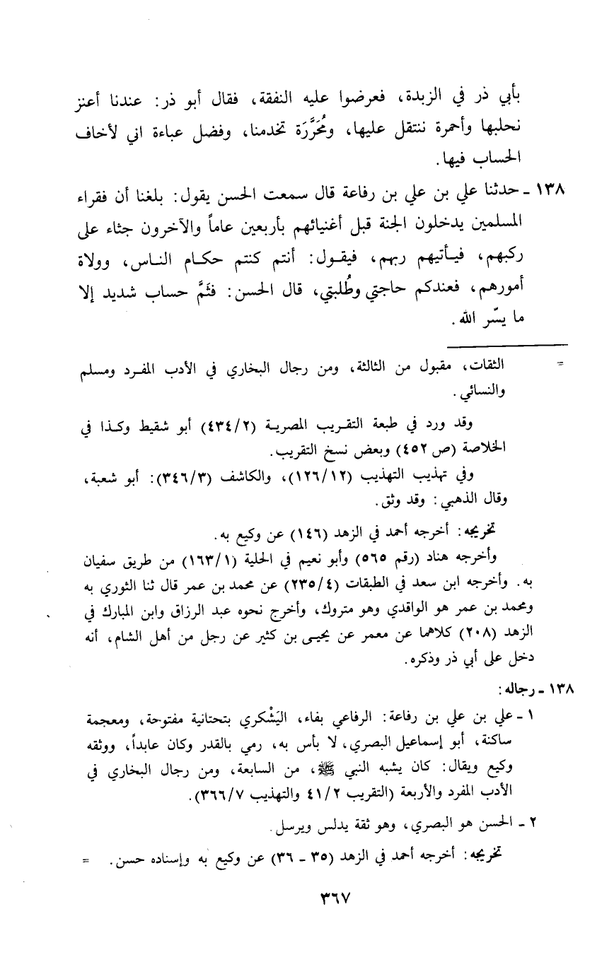 138 - حَدَّثَنَا عَلِيُّ بْنُ عَلِيِّ بْنِ رِفَاعَةَ، قَالَ: سَمِعْتُ الْحَسَنَ، يَقُولُ: §بَلَغَنَا أَنَّ فُقَرَاءَ الْمُسْلِمِينَ يَدْخُلُونَ الْجَنَّةَ قَبْلَ أَغْنِيَائِهِمْ بِأَرْبَعِينَ عَامًا، وَالْآخَرُونَ جُثَاءٌ عَلَى رُكَبِهِمْ، فَيَأْتِيهِمْ رَبُّهُمْ، فَيَقُولُ: أَنْتُمْ كُنْتُمْ حُكَّامَ النَّاسِ، وَوُلَاةَ أُمُورِهِمْ، فَعِنْدَكُمْ حَاجَتِي وطَلِبَتِي، قَالَ الْحَسَنُ: فَثَمَّ حِسَابٌ شَدِيدٌ إِلَّا مَا يَسَّرَ اللَّهُ