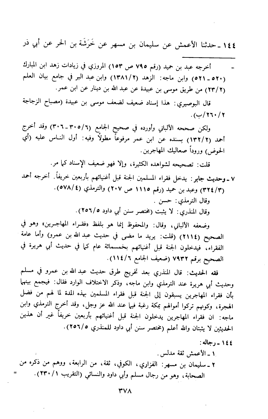 144 - حَدَّثَنَا الْأَعْمَشُ، عَنْ سُلَيْمَانَ بْنِ مِسْهَرٍ، عَنْ خَرَشَةَ بْنِ الْحُرِّ، عَنْ أَبِي ذَرٍّ، -[379]- قَالَ: قَالَ رَسُولُ اللَّهِ صَلَّى اللهُ عَلَيْهِ وَسَلَّمَ: «§يَا أَبَا ذَرٍّ انْظُرْ أَرْفَعَ رَجُلٍ فِي الْمَسْجِدِ» ، قَالَ: فَنَظَرْتُ، فَإِذَا رَجُلٌ عَلَيْهِ حُلَّةٌ، قَالَ: قُلْتُ: هَذَا؟ قَالَ: «انْظُرْ أَوْضَعَ رَجُلٍ فِي الْمَسْجِدِ» ، قَالَ: فَنَظَرْتُ، فَإِذَا رَجُلٌ عَلَيْهِ أَخْلَاقٌ، فَقُلْتُ: هَذَا؟ فَقَالَ رَسُولُ اللَّهِ صَلَّى اللهُ عَلَيْهِ وَسَلَّمَ: «لَهَذَا خَيْرٌ عِنْدَ اللَّهِ يَوْمَ الْقِيَامَةِ مِنْ مِلْءِ الْأَرْضِ مِنْ هَذَا»
