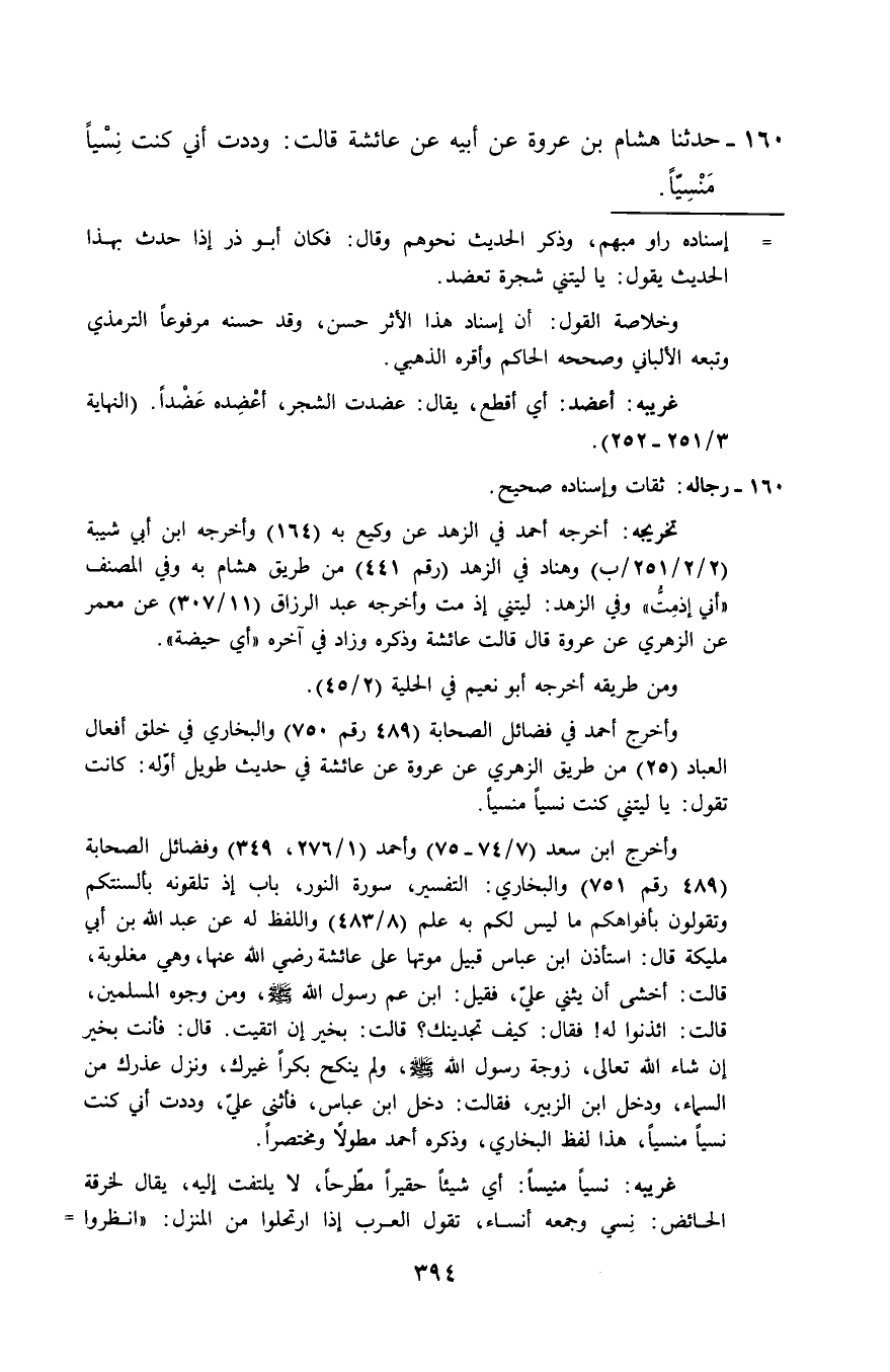 160 - حَدَّثَنَا هِشَامُ بْنُ عُرْوَةَ عَنْ أَبِيهِ عَنْ عَائِشَةَ قَالَتْ: " §وَدِدْتُ أَنِّي كُنْتُ نَسْيًا مَنْسِيًّا