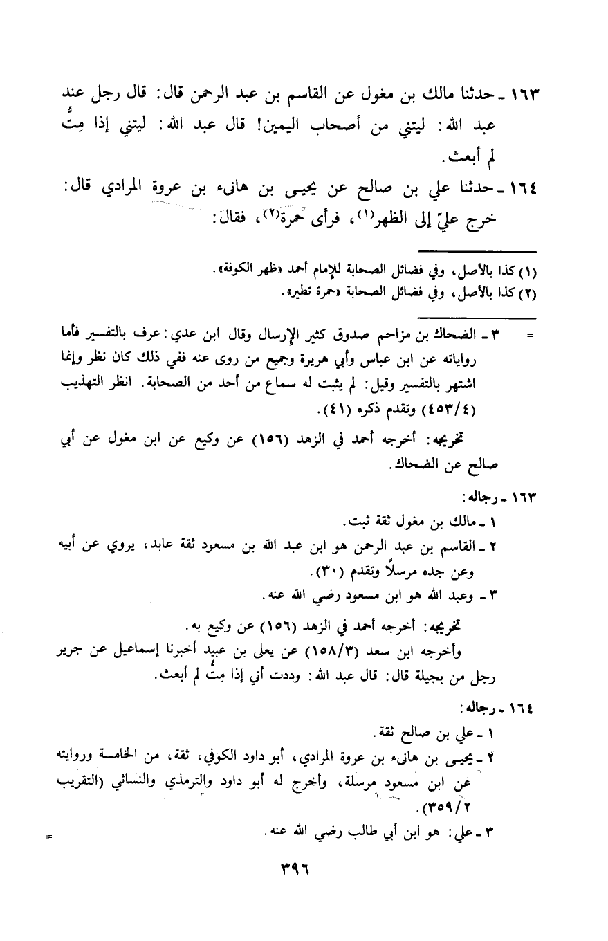 163 - حَدَّثَنَا مَالِكُ بْنُ مِغْوَلٍ، عَنِ الْقَاسِمِ بْنِ عَبْدِ الرَّحْمَنِ، قَالَ: قَالَ رَجُلٌ عِنْدَ عَبْدِ اللَّهِ: §لَيْتَنِي مِنْ أَصْحَابِ الْيَمِينِ قَالَ عَبْدُ اللَّهِ: لَيْتَنِي إِذَا مِتُّ لَمْ أُبْعَثْ