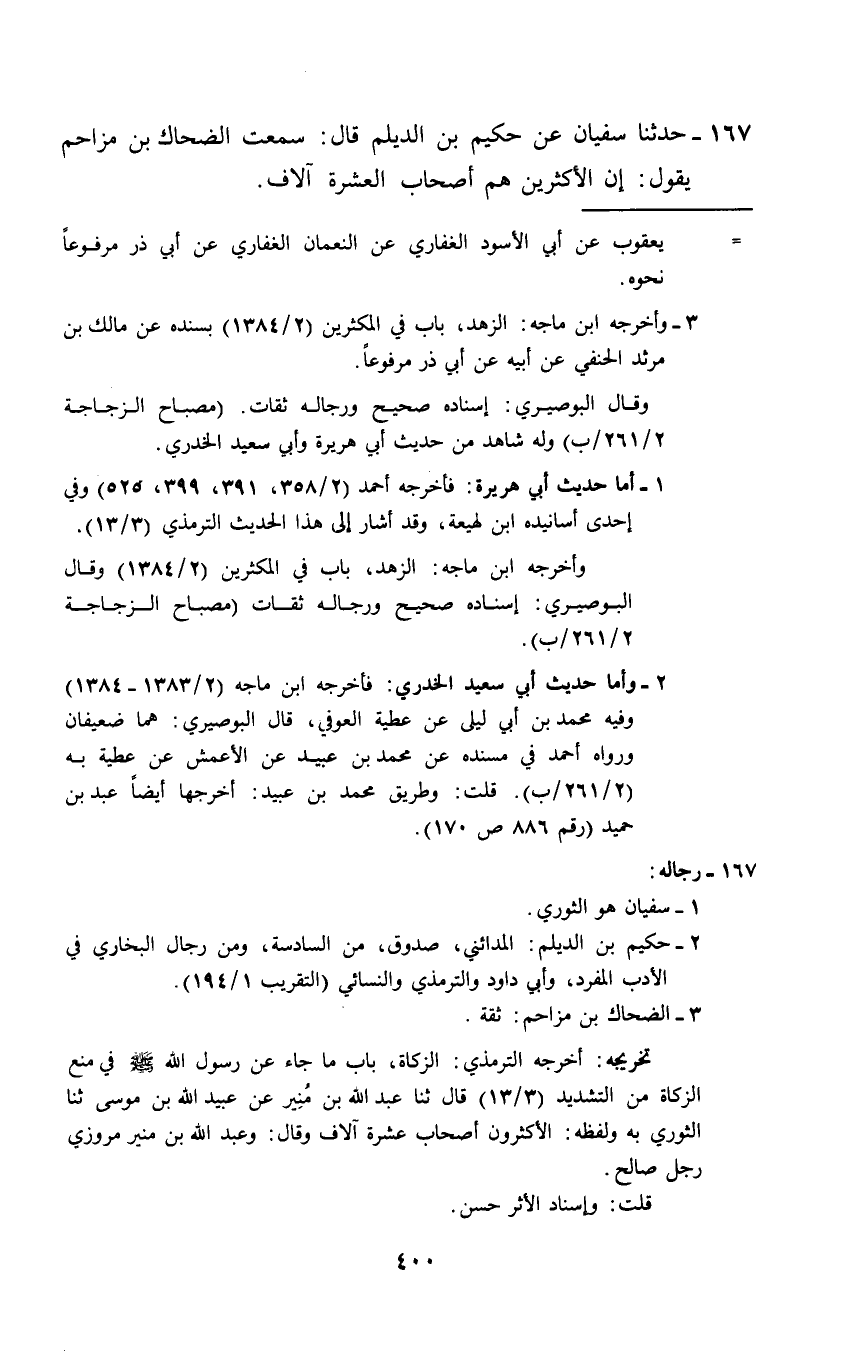 167 - حَدَّثَنَا سُفْيَانُ عَنْ حَكِيمِ بْنِ الدَّيْلَمِ، قَالَ: سَمِعْتُ الضَّحَّاكَ بْنَ مُزَاحِمٍ يَقُولُ: §إِنَّ الْأَكْثَرِينَ هُمْ أَصْحَابُ الْعَشْرَةِ آلَافٍ