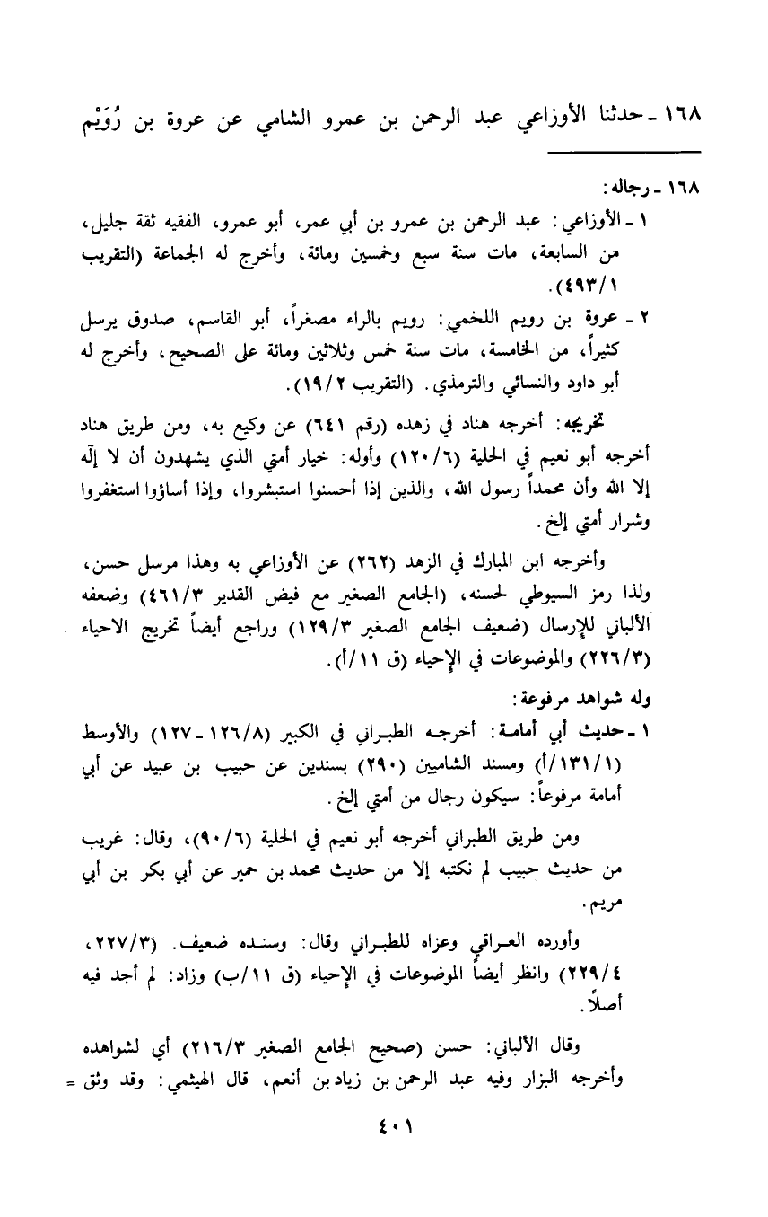 168 - حَدَّثَنَا الْأَوْزَاعِيُّ عَبْدُ الرَّحْمَنِ بْنُ عَمْرٍو الشَّامِيُّ، عَنْ عُرْوَةَ بْنِ رُوَيْمٍ -[402]- اللَّخْمِيِّ، قَالَ: قَالَ رَسُولُ اللَّهِ صَلَّى اللهُ عَلَيْهِ وَسَلَّمَ: «§شِرَارُ أُمَّتِي الَّذِينَ وُلِدُوا فِي النَّعِيمِ وَغُذُّوا بِهِ، إِنَّمَا هِمَّتُهُمْ أَلْوَانُ الطَّعَامِ وَالثِّيَابِ، وَيَتَشَدَّقُونَ فِي الْكَلَامِ»