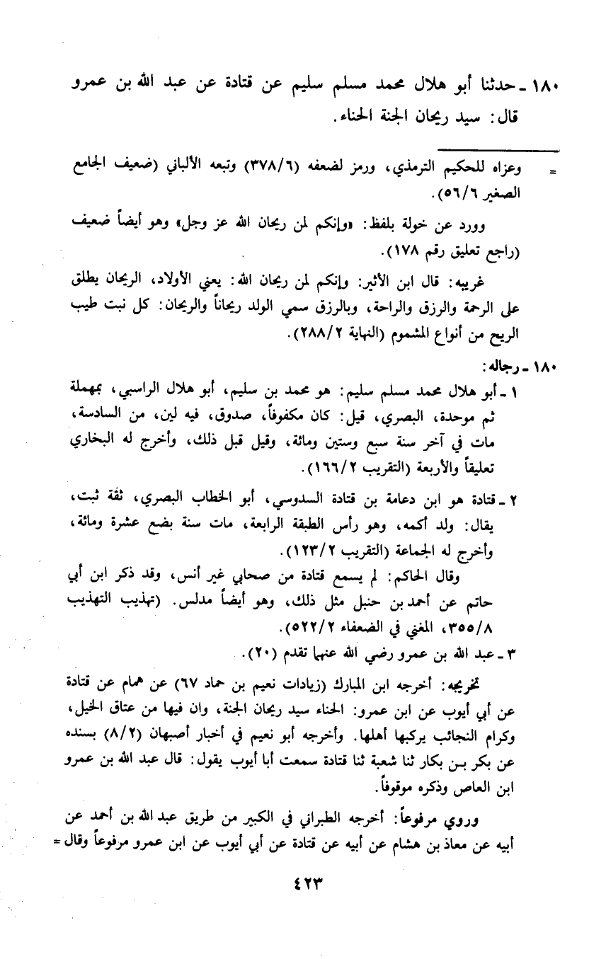180 - حَدَّثَنَا أَبُو هِلَالٍ مُحَمَّدُ بْنُ سُلَيْمٍ، عَنْ قَتَادَةَ، عَنْ عَبْدِ اللَّهِ بْنِ عَمْرٍو، قَالَ: §سَيِّدُ رَيْحَانِ الْجَنَّةِ الْحِنَّاءُ