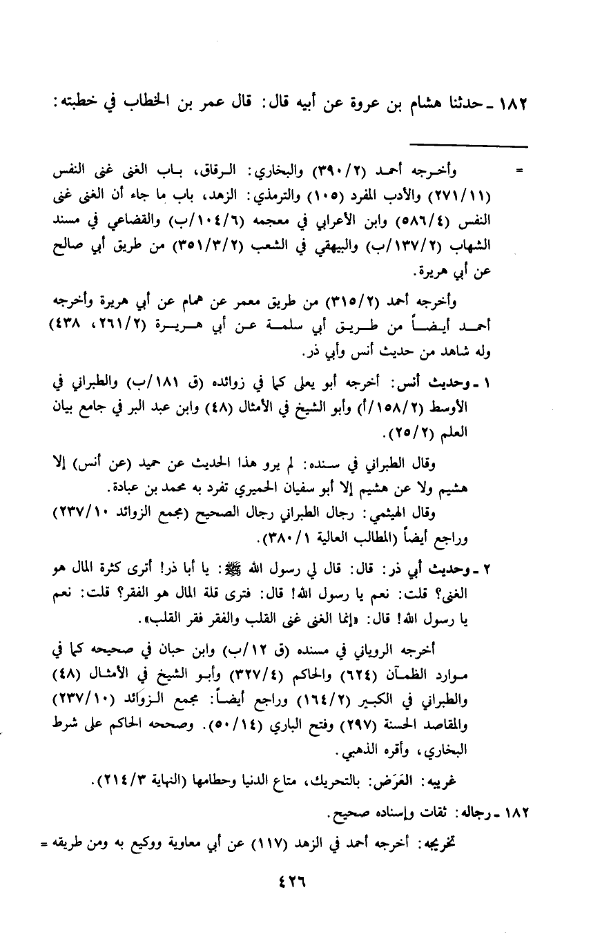 182 - حَدَّثَنَا هِشَامُ بْنُ عُرْوَةَ، عَنْ أَبِيهِ قَالَ: قَالَ عُمَرُ بْنُ الْخَطَّابِ فِي خُطْبَتِهِ: -[427]- §أَتَعْلَمُنَّ أَنَّ الطَّمَعَ فَقْرٌ، وَأَنَّ الْإِيَاسَ غِنًى، وَأَنَّ الْمَرْءَ إِذَا أَيِسَ مِنْ شَيْءٍ اسْتَغْنَى عَنْهُ