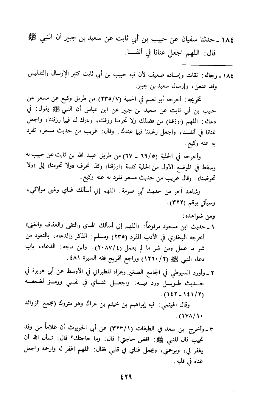 184 - حَدَّثَنَا سُفْيَانُ، عَنْ حَبِيبِ بْنِ أَبِي ثَابِتٍ عَنْ سَعِيدِ بْنِ جُبَيْرٍ أَنَّ النَّبِيَّ صَلَّى اللهُ عَلَيْهِ وَسَلَّمَ قَالَ: «§اللَّهُمَّ اجْعَلْ غِنَانَا فِي أَنْفُسِنَا»