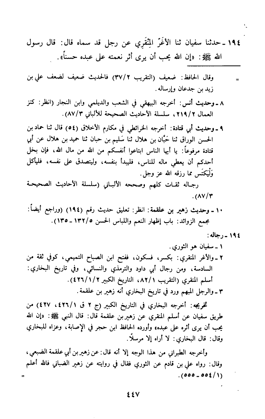 194 - حَدَّثَنَا سُفْيَانُ، ثنا الْأَغَرُّ الْمِنْقَرِيُّ، عَنْ رَجُلٍ قَدْ سَمَّاهُ قَالَ: قَالَ رَسُولُ اللَّهِ صَلَّى اللهُ عَلَيْهِ وَسَلَّمَ: «§إِنَّ اللَّهَ يُحِبُّ أَنْ يَرَى أَثَرَ نِعْمَتِهِ عَلَى عَبْدِهِ حَسَنًا»