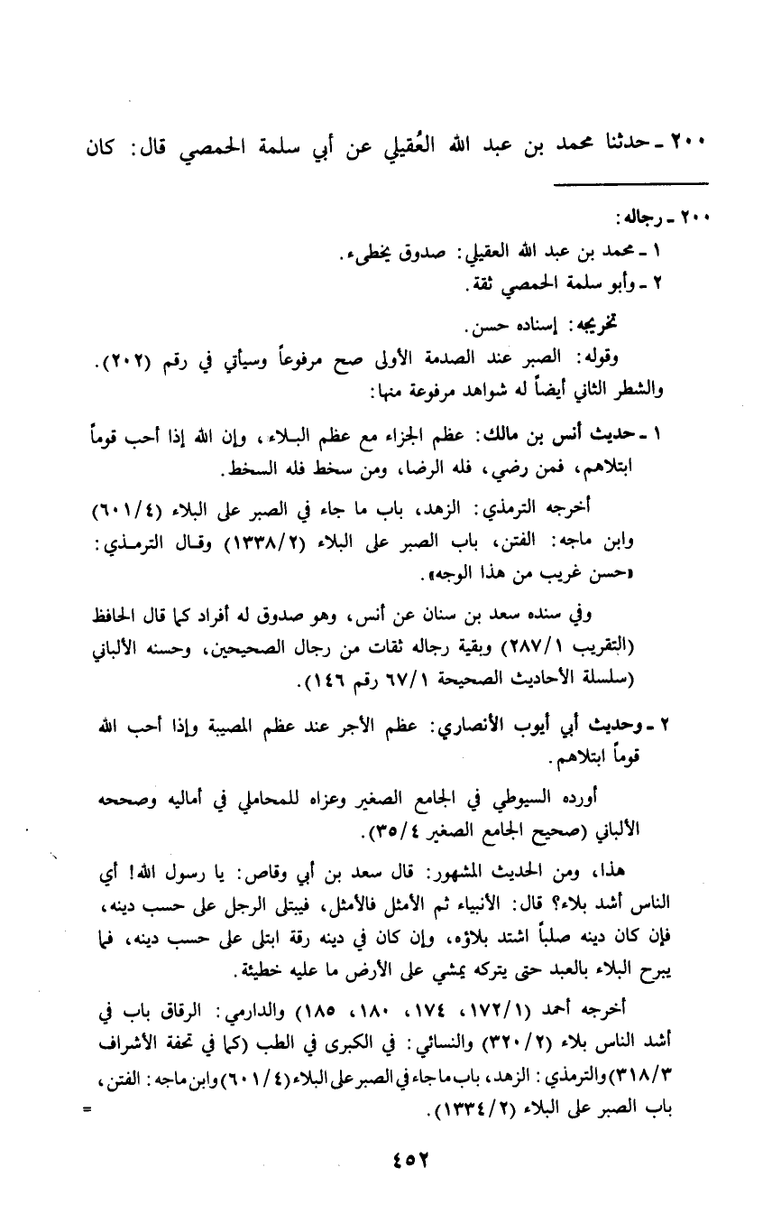 200 - حَدَّثَنَا مُحَمَّدُ بْنُ عَبْدِ اللَّهِ الْعُقَيْلِيُّ، عَنْ أَبِي سَلَمَةَ الْحِمْصِيِّ قَالَ: كَانَ -[453]- يُقَالُ: «§الصَّبْرُ عِنْدَ الصَّدْمَةِ الْأُولَى، وَعِنْدَ كُلِّ بَلَاءٍ، وَعِنْدَ كُلِّ لِقَاءٍ، مَنْ رَضِيَ فَلُهُ الرِّضَا، وَمَنْ سَخِطَ فَلُهُ السُّخْطُ»