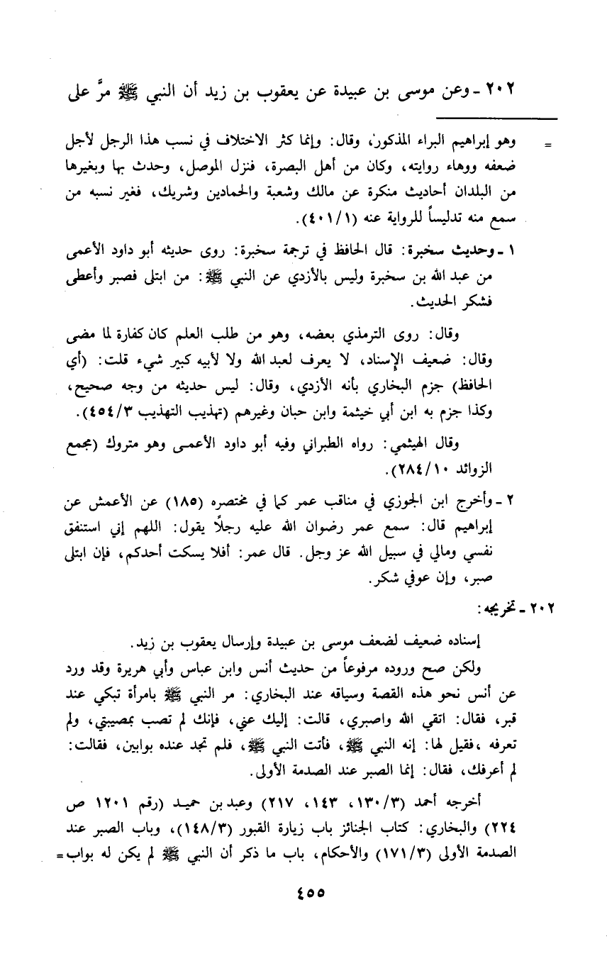 202 - وَعَنْ مُوسَى بْنِ عُبَيْدَةَ، عَنْ يَعْقُوبَ بْنِ زَيْدٍ أَنَّ النَّبِيَّ صَلَّى اللهُ عَلَيْهِ وَسَلَّمَ مَرَّ عَلَى -[456]- امْرَأَةٍ تَبْكِي، فَكَلَّمَهَا، فَلَمْ تَلْتَفِتْ إِلَيْهِ، فَأُخْبِرَتْ بَعْدُ أَنَّهُ النَّبِيُّ صَلَّى اللهُ عَلَيْهِ وَسَلَّمَ فَأَتَتْهُ، فَقَالَ النَّبِيُّ صَلَّى اللهُ عَلَيْهِ وَسَلَّمَ: «§إِنَّمَا الصَّبْرُ عِنْدَ الصَّدْمَةِ الْأُولَى»