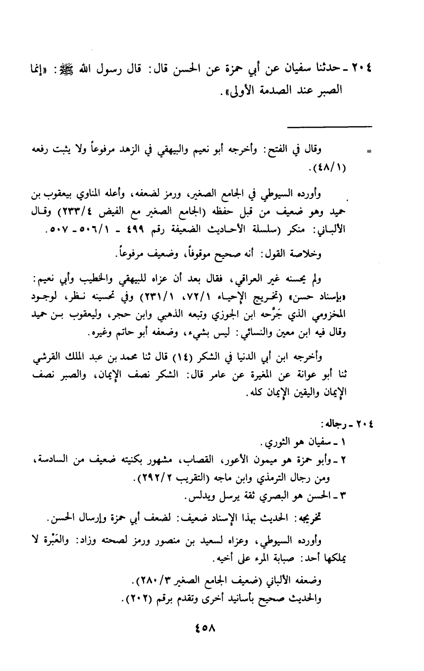 204 - حَدَّثَنَا سُفْيَانُ، عَنْ أَبِي حَمْزَةَ، عَنِ الْحَسَنِ قَالَ: قَالَ رَسُولُ اللَّهِ صَلَّى اللهُ عَلَيْهِ وَسَلَّمَ: «§إِنَّمَا الصَّبْرُ عِنْدَ الصَّدْمَةِ الْأُولَى»