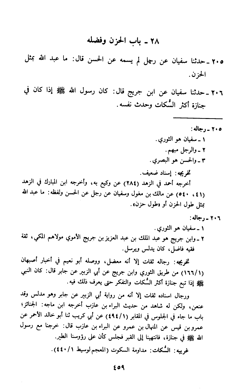 205 - حَدَّثَنَا سُفْيَانُ، عَنْ رَجُلٍ لَمْ يُسَمِّهِ عَنِ الْحَسَنِ قَالَ: «§مَا عُبِدَ اللَّهُ بِمِثْلِ الْحَزَنِ»