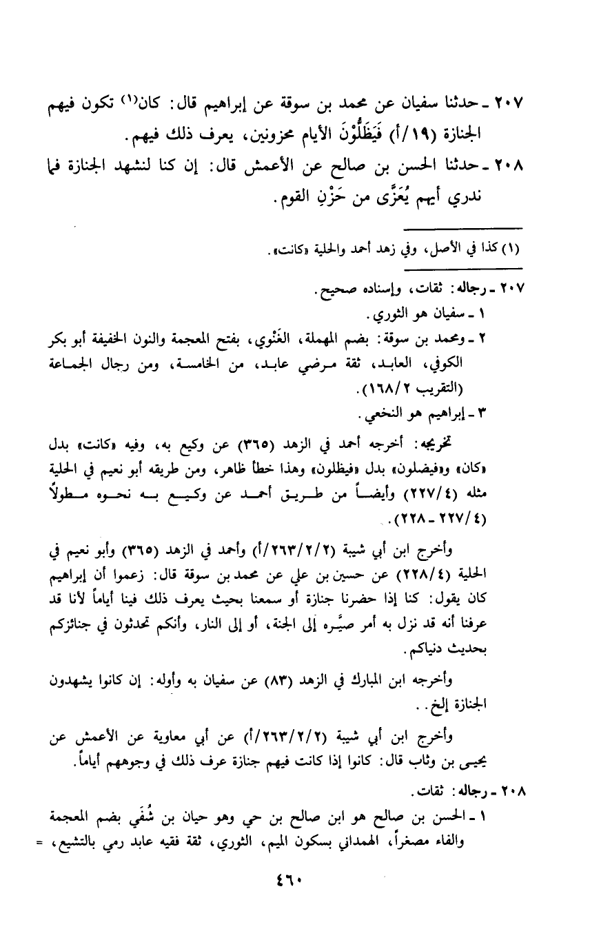 207 - حَدَّثَنَا سُفْيَانُ، عَنْ مُحَمَّدِ بْنِ سُوقَةَ، عَنْ إِبْرَاهِيمَ قَالَ: «§كَانَ تَكُونُ فِيهِمُ الْجِنَازَةُ فَيَظَلُّونَ الْأَيَّامَ مَحْزُونِينَ، يُعْرَفُ ذَلِكَ فِيهِمْ»
