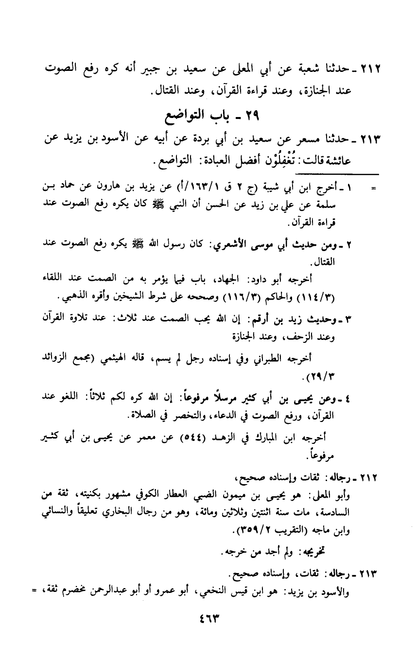 212 - حَدَّثَنَا شُعْبَةُ، عَنْ أَبِي الْمُعَلَّى، عَنْ سَعِيدِ بْنِ جُبَيْرٍ §أَنَّهُ كَرِهَ رَفْعَ الصَّوْتِ عِنْدَ الْجِنَازَةِ، وَعِنْدَ قِرَاءَةِ الْقُرْآنِ، وَعِنْدَ الْقِتَالِ