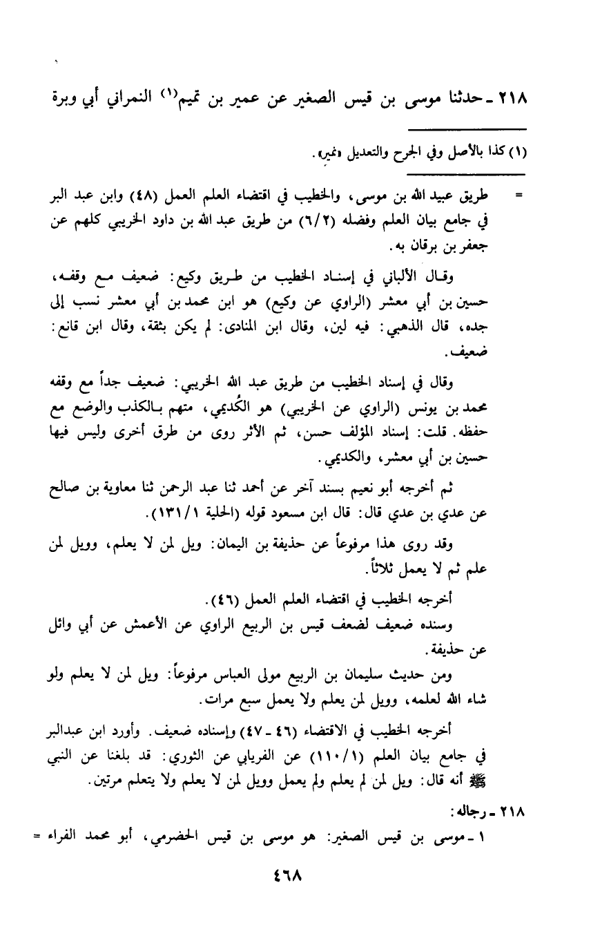 218 - حَدَّثَنَا مُوسَى بْنُ قَيْسٍ الصَّغِيرُ، عَنْ عُمَيْرِ بْنِ تَمِيمٍ النِّمْرَانِيِّ أَبِي وَبْرَةَ -[469]- الْهَمْدَانِيِّ قَالَ سَأَلْتُ ابْنَ عَبَّاسٍ عَنْ مَسْأَلَةٍ؟ فَقَالَ: «لَا تَسْأَلْ فَإِنَّكَ §إِنْ تَأْتِ الشَّيْءَ وَأَنْتَ لَا تَعْلَمُهُ أَهْوَنُ مِنْ أَنْ تَأْتِيَهُ وَأَنْتَ تَعْلَمُهُ»