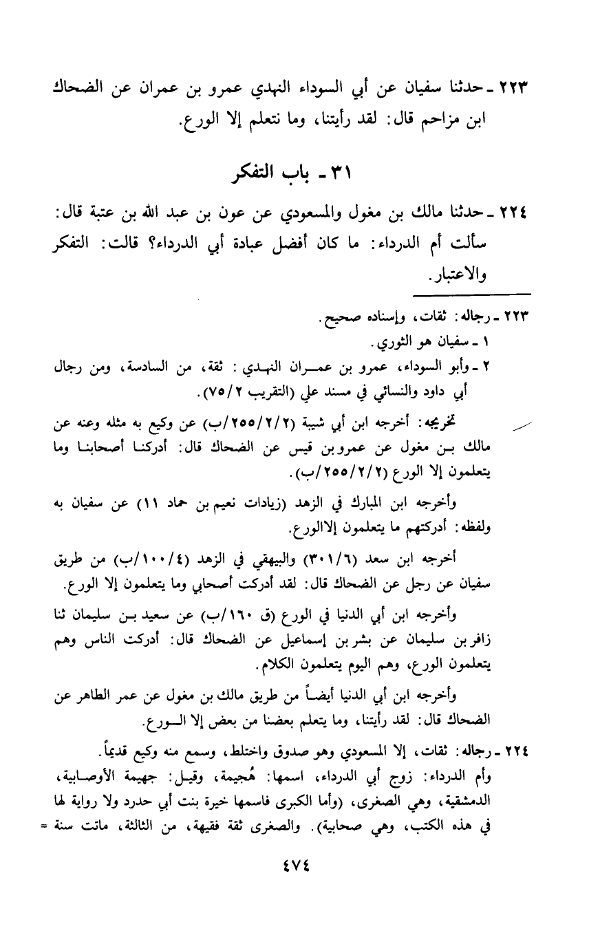 223 - حَدَّثَنَا سُفْيَانُ، عَنْ أَبِي السَّوْدَاءِ النَّهْدِيِّ عَمْرِو بْنِ عِمْرَانَ، عَنِ الضَّحَّاكِ بْنِ مُزَاحِمٍ قَالَ: «§لَقَدْ رَأَيْتُنَا، وَمَا نَتَعَلَّمُ إِلَّا الْوَرَعَ»