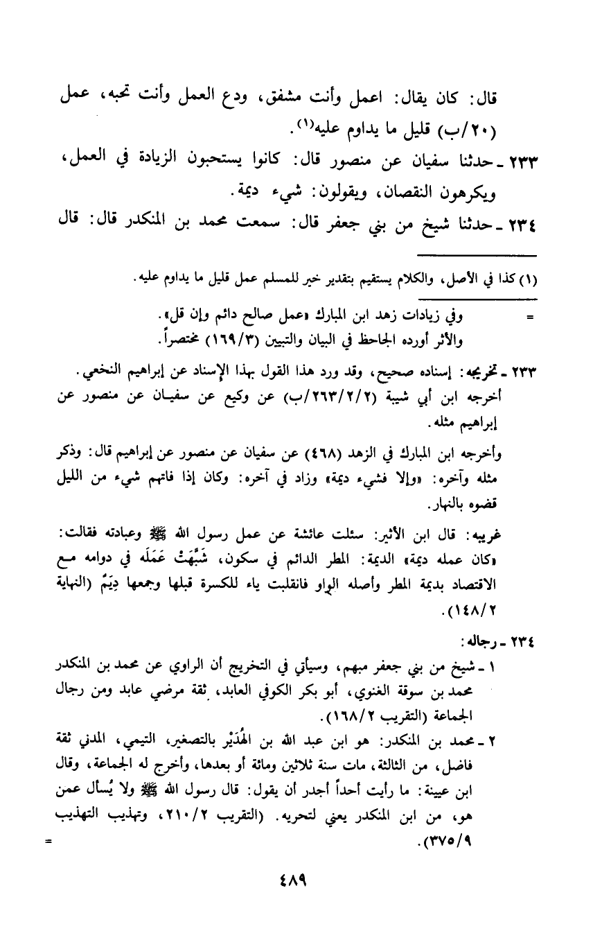 233 - حَدَّثَنَا سُفْيَانُ، عَنْ مَنْصُورٍ قَالَ: §كَانُوا يَسْتَحِبُّونَ الزِّيَادَةَ فِي الْعَمَلِ، وَيَكْرَهُونَ النُّقْصَانَ، وَيَقُولُونَ: شَيْءٌ دِيمَةٌ