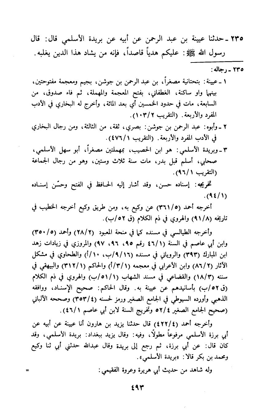 235 - حَدَّثَنَا عُيَيْنَةُ بْنُ عَبْدِ الرَّحْمَنِ، عَنْ أَبِيهِ، عَنْ بُرَيْدَةَ الْأَسْلَمِيِّ قَالَ: قَالَ رَسُولُ اللَّهِ صَلَّى اللهُ عَلَيْهِ وَسَلَّمَ: §عَلَيْكُمْ هَدْيًا قَاصِدًا، فَإِنَّهُ مَنْ يُشَادَّ هَذَا الدِّينَ يَغْلِبْهُ "