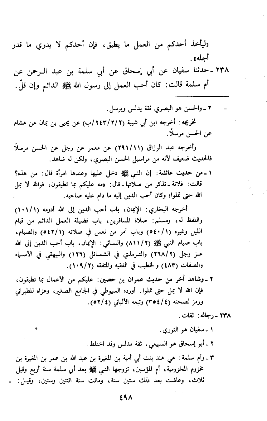 238 - حَدَّثَنَا سُفْيَانُ، عَنْ أَبِي إِسْحَاقَ، عَنْ أَبِي سَلَمَةَ بْنِ عَبْدِ الرَّحْمَنِ، عَنْ أَمِّ سَلَمَةَ قَالَتْ: «كَانَ §أَحَبُّ الْعَمَلِ إِلَى رَسُولِ اللَّهِ صَلَّى اللهُ عَلَيْهِ وَسَلَّمَ الدَّائِمَ وَإِنْ قَلَّ»
