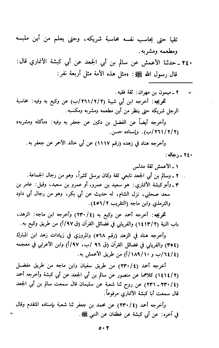240 - حَدَّثَنَا الْأَعْمَشُ، عَنْ سَالِمِ بْنِ أَبِي الْجَعْدِ، عَنْ أَبِي كَبْشَةَ الْأَنْمَارِيِّ قَالَ: قَالَ رَسُولُ اللَّهِ صَلَّى اللهُ عَلَيْهِ وَسَلَّمَ: " §مَثَلُ هَذِهِ الْأُمَّةِ مَثَلُ أَرْبَعَةِ نَفَرٍ: -[503]- رَجُلٌ آتَاهُ اللَّهُ مَالًا وَعِلْمًا، فَهُوَ يَعْمَلُ بِعِلْمِهِ فِي مَالِهِ، يُنْفِقُهُ فِي حَقِّهِ، وَرَجُلٌ آتَاهُ اللَّهُ عِلْمًا، وَلَمْ يُؤْتِهِ مَالًا، فَهُوَ يَقُولُ: لَوْ كَانَ لِي مِثْلُ مَال هَذَا عَمِلْتُ فِيهِ مِثْلَ الَّذِي يَعْمَلُ فَقَالَ رَسُولُ اللَّهِ صَلَّى اللهُ عَلَيْهِ وَسَلَّمَ: «فَهُمَا فِي الْأَجْرِ سَوَاءٌ» وَرَجُلٌ آتَاهُ اللَّهُ مَالًا، وَلَمْ يُؤْتِهِ عِلْمًا، فَهُوَ يَخْبِطُ فِي مَالِهِ، يُنْفِقُهُ فِي غَيْرِ حَقِّهِ، وَرَجُلٌ لَمْ يُؤْتِهِ مَالًا وَلَا عِلْمًا، فَهُوَ يَقُولُ: لَوْ كَانَ لِي مِثْلُ مَال ِهَذَا عَمِلْتُ فِيهِ مِثْلَ الَّذِي يَعْمَلُ قَالَ رَسُولُ اللَّهِ صَلَّى اللهُ عَلَيْهِ وَسَلَّمَ: «فَهُمَا فِي الْوِزْرِ سَوَاءٌ»