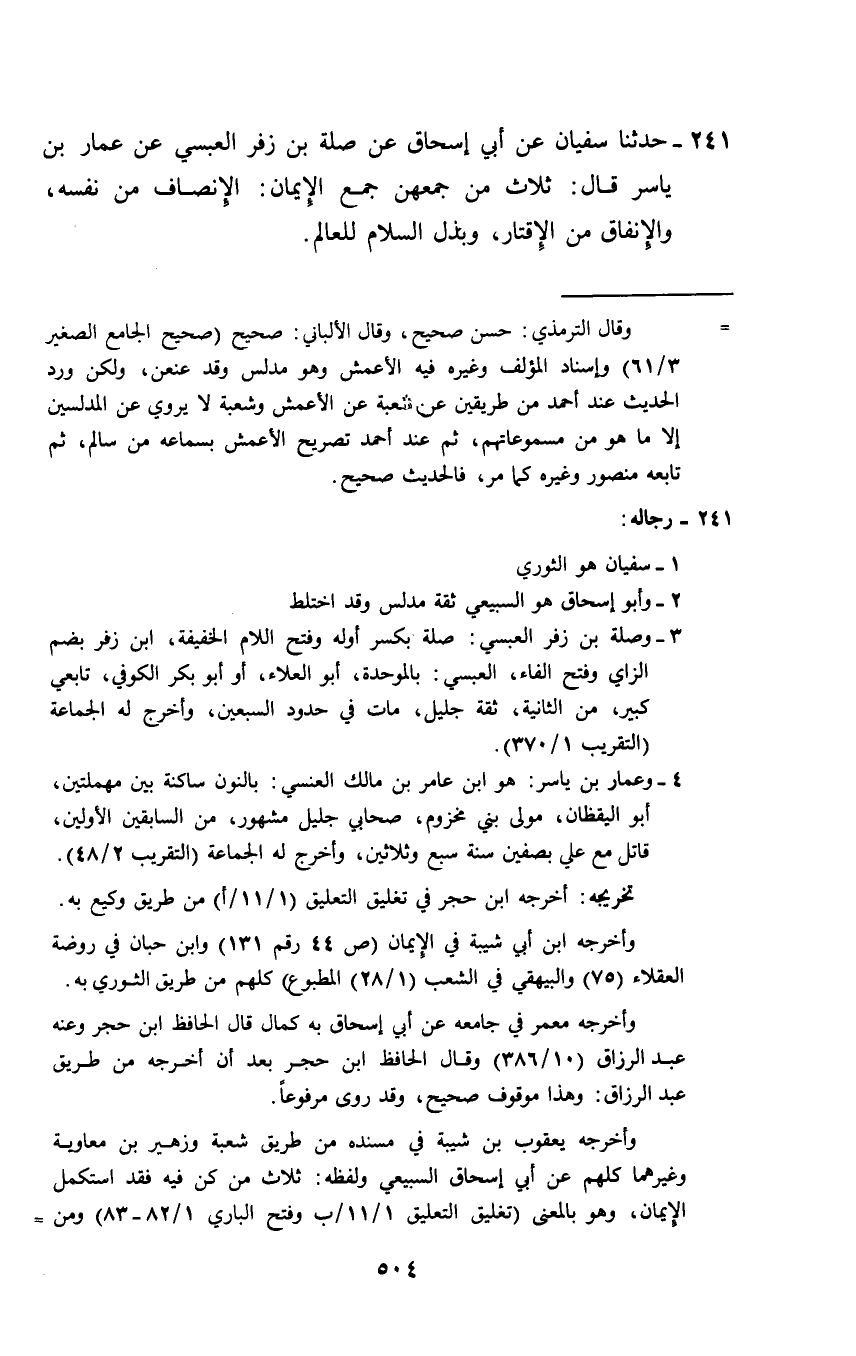 241 - حَدَّثَنَا سُفْيَانُ، عَنْ أَبِي إِسْحَاقَ، عَنْ صِلَةَ بْنِ زُفَرَ الْعَبْسِيِّ، عَنْ عَمَّارِ بْنِ يَاسِرٍ قَالَ: " §ثَلَاثٌ مَنْ جَمَعَهُنَّ جَمَعَ الْإِيمَانَ: الْإِنْصَافُ مِنْ نَفْسِهِ، وَالْإِنْفَاقُ مِنَ الْإِقْتَارِ، وَبَذْلُ السَّلَامِ لِلْعَالِمِ "