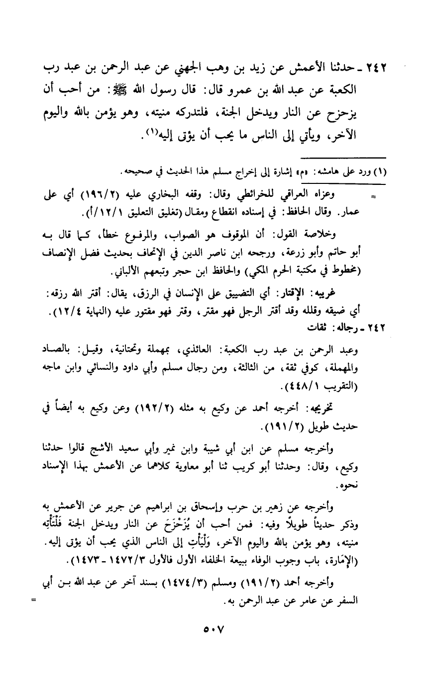 242 - حَدَّثَنَا الْأَعْمَشُ، عَنْ زَيْدِ بْنِ وَهْبٍ الْجُهَنِيِّ، عَنْ عَبْدِ الرَّحْمَنِ بْنِ عَبْدِ رَبِّ الْكَعْبَةِ، عَنْ عَبْدِ اللَّهِ بْنِ عَمْرٍو، قَالَ: قَالَ رَسُولُ اللَّهِ صَلَّى اللهُ عَلَيْهِ وَسَلَّمَ: §مَنْ أَحَبَّ أَنْ يُزَحْزَحَ عَنِ النَّارِ وَيَدْخُلَ الْجَنَّةَ، فَلْتُدْرِكْهُ مَنِيَّتُهُ، وَهُوَ يُؤْمِنُ بِاللَّهِ وَالْيَوْمِ الْآخِرِ، وَيَأْتِي إِلَى النَّاسِ مَا يُحِبُّ أَنْ يُؤْتَى إِلَيْهِ "