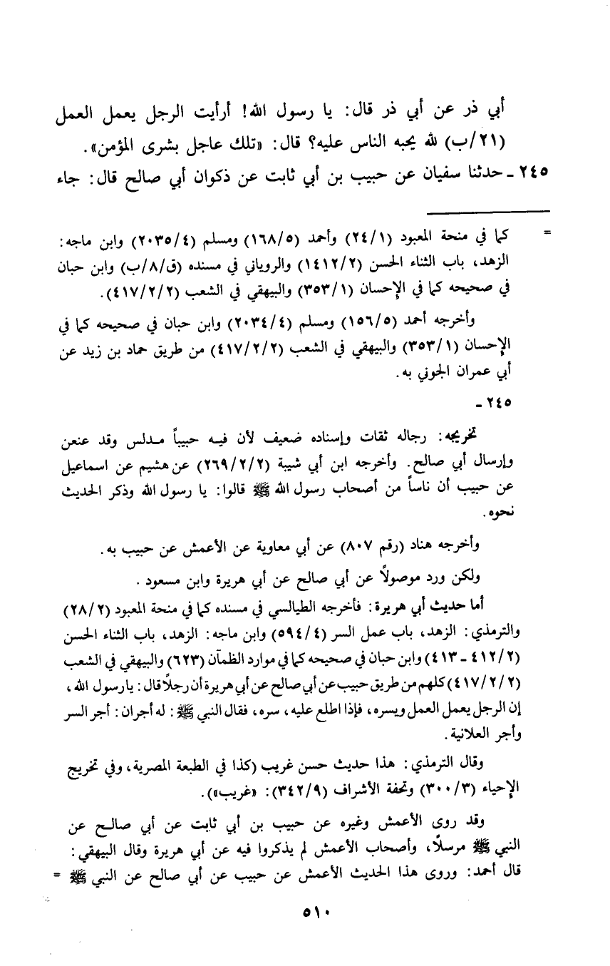 245 - حَدَّثَنَا سُفْيَانُ عَنْ حَبِيبِ بْنِ أَبِي ثَابِتٍ، عَنْ ذَكْوَانَ أَبِي صَالِحٍ، قَالَ: جَاءَ -[511]- رَجُلٌ إِلَى النَّبِيِّ صَلَّى اللهُ عَلَيْهِ وَسَلَّمَ فَقَالَ: يَا رَسُولَ اللَّهِ إِنِّي أَعْمَلُ الْعَمَلَ، فَأَسْتُرُهُ، فَيُطَّلَعُ عَلَيْهِ، فَيُعْجِبُنِي؟ قَالَ: " §لَكَ أَجْرَانِ: أَجْرُ السِّرِّ، وَأَجْرُ الْعَلَانِيَةِ "