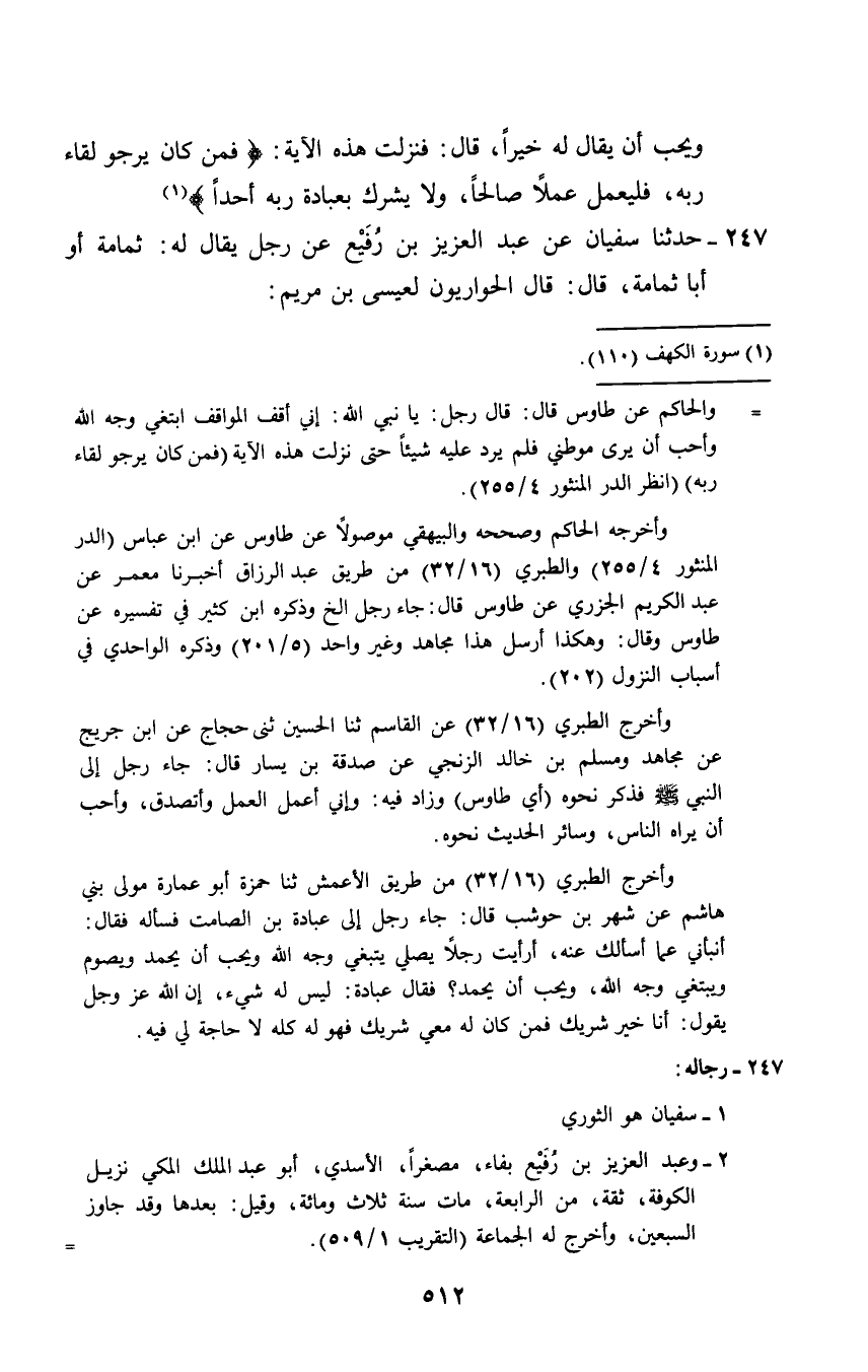 247 - حَدَّثَنَا سُفْيَانُ، عَنْ عَبْدِ الْعَزِيزِ بْنِ رُفَيْعٍ، عَنْ رَجُلٍ يُقَالُ لَهُ: ثُمَامَةَ أَوْ أَبَا ثُمَامَةَ، قَالَ: قَالَ الْحَوَارِيُّونَ لعِيسَى ابْنِ مَرْيَمَ: -[513]- §مَا الْخَالِصُ مِنَ الْعَمَلِ؟ قَالَ: مَا لَا تُحِبُّ أَنْ يَحَمْدَكَ النَّاسُ عَلَيْهِ. قَالُوا: فَمَا النُّصْحُ لِلَّهِ؟ قَالَ: أَنْ تَبْدَأَ بِحَقِّ اللَّهِ قَبْلَ حَقِّ النَّاسِ، وإِذاَ عَرَضَ لَكَ أَمْرَانِ: أَحَدُهُمَا لِلَّهِ، وَالْآخِرُ لِلدُّنْيَا، بَدَأْتَ حَقَّ اللَّهِ