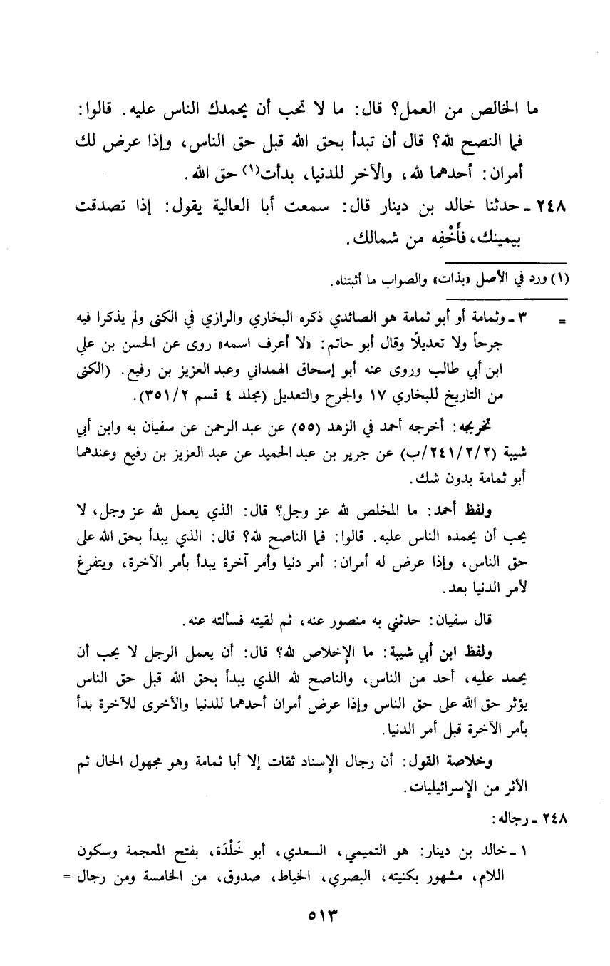 248 - حَدَّثَنَا خَالِدُ بْنُ دِينَارٍ قَالَ: سَمِعْتُ أَبَا الْعَالِيَةِ يَقُولُ: «§إِذَا تَصَدَّقْتَ بِيَمِينِكَ، فَأَخْفِهِ مِنْ شِمَالِكَ»