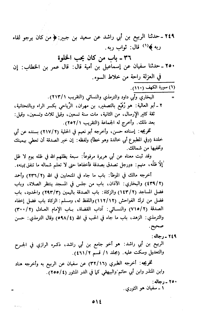 250 - حَدَّثَنَا سُفْيَانُ، عَنْ إِسْمَاعِيلَ بْنِ أُمَيَّةَ قَالَ: قَالَ عُمَرُ بْنُ الْخَطَّابِ: «§إِنَّ فِي الْعُزْلَةِ رَاحَةً مِنْ خِلَاطِ السُّوءِ»