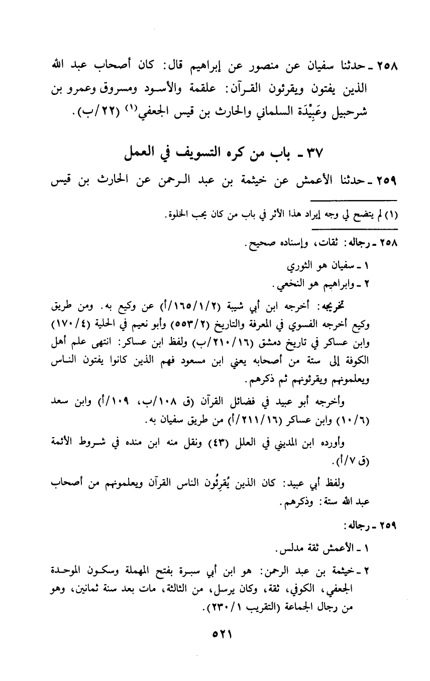 258 - حَدَّثَنَا سُفْيَانُ، عَنْ مَنْصُورٍ، عَنْ إِبْرَاهِيمَ، قَالَ: " §كَانَ أَصْحَابَ عَبْدِ اللَّهِ الَّذِينَ يُفْتُونَ وَيُقْرِئُونَ الْقُرْآنَ: عَلْقَمَةُ، وَالْأَسْوَدُ، ومَسْرُوقٌ، وعَمْرُو بْنُ شُرَحْبِيلَ، وعَبِيدَةُ السَّلْمَانِيُّ، وَالْحَارِثُ بْنُ قَيْسٍ الْجُعْفِيُّ "