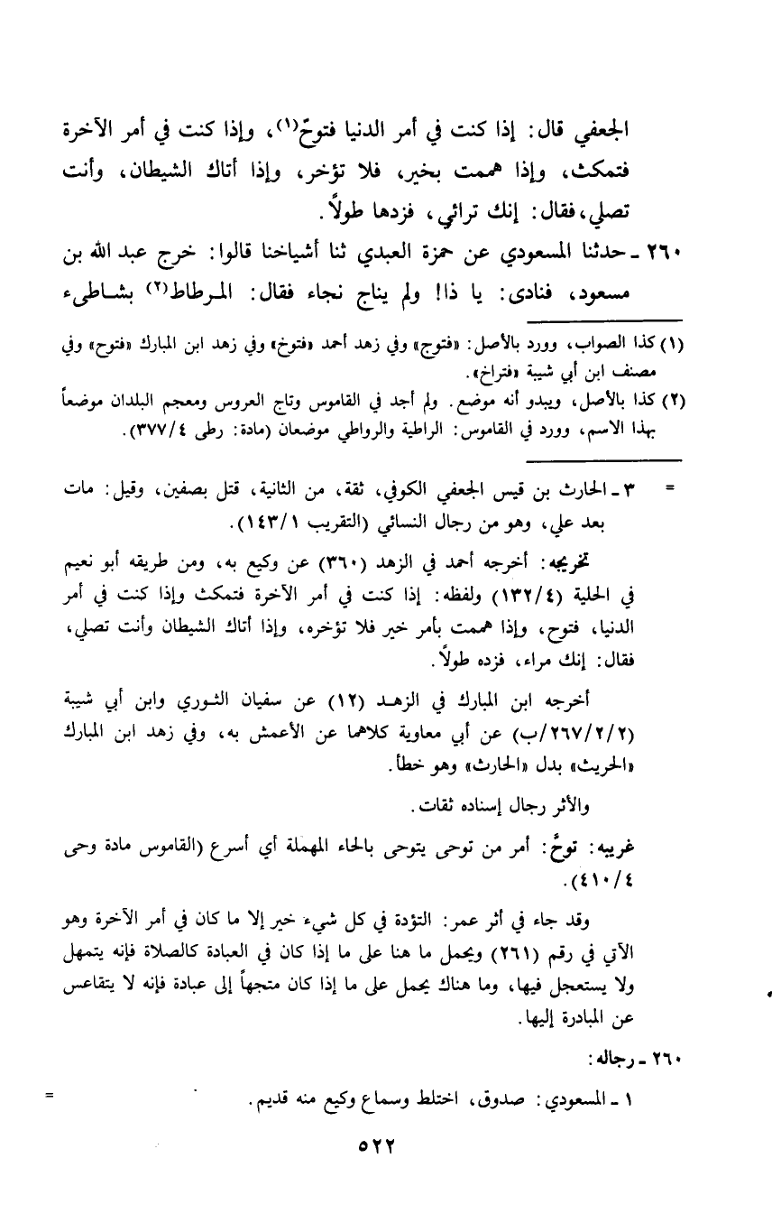 260 - حَدَّثَنَا الْمَسْعُودِيُّ، عَنْ حَمْزَةَ الْعَبْدِيِّ ثَنَا أَشْيَاخُنَا قَالُوا: خَرَجَ عَبْدُ اللَّهِ بْنُ مَسْعُودٍ، فَنَادَى: §يَا ذَا وَلَمْ يُنَاجِ نَجَاءً فَقَالَ: الْمِرْطَاطُ بِشَاطِئِ -[523]- الْفُرَاتِ - طَرِيقُ بُغْيَةِ الْمُؤْمِنِينَ هِرَابٌ مِنَ الدَّجَّالِ. قَالَ: فَمَا يَنْتَظِرُونَ بِالْعَمَلِ؟ أَخُرُوجَ الدَّجَّالِ، فَبِئْسَ الْمُنْتَظَرُ، أَوْ قِيَامَ السَّاعَةِ؟ فَالسَّاعَةُ أَدْهَى وَأَمَرُّ، ثُمَّ أَخَذَ حَصَاةً، فَقَالَ بِهَا هَكَذَا عَلَى ظُفْرِهِ: مَا خُرُوجُ الدَّجَّالِ بِأَنْقَصَ لِإِيمَانِ مُؤْمِنٍ إِلَّا مَا نَقَصَ هَذِهِ الْحَصَاةُ مِنْ ظُفْرِي "