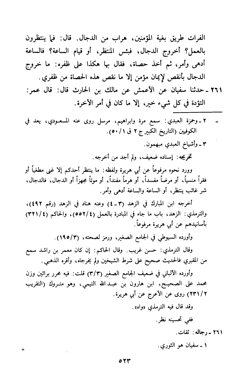261 - حَدَّثَنَا سُفْيَانُ، عَنِ الْأَعْمَشِ، عَنْ مَالِكِ بْنِ الْحَارِثِ قَالَ: قَالَ عُمَرُ: «§التُّؤَدَةُ فِي كُلِّ شَيْءٍ خَيْرٌ، إِلَّا مَا كَانَ فِي أَمْرِ الْآخِرَةِ»