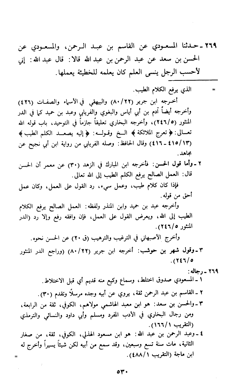 269 - حَدَّثَنَا الْمَسْعُودِيُّ، عَنِ الْقَاسِمِ بْنِ عَبْدِ الرَّحْمَنِ، وَالْمَسْعُودِيُّ، عَنِ الْحَسَنِ بْنِ سَعْدٍ عَنْ عَبْدِ الرَّحْمَنِ بْنِ عَبْدِ اللَّهِ قَالَا: قَالَ عَبْدُ اللَّهِ: «§إِنِّي لَأَحْسَبُ الرَّجُلَ يَنْسَى الْعِلْمَ كَانَ يَعْلَمُهُ لِلْخَطِيئَةِ يَعْمَلُهَا»