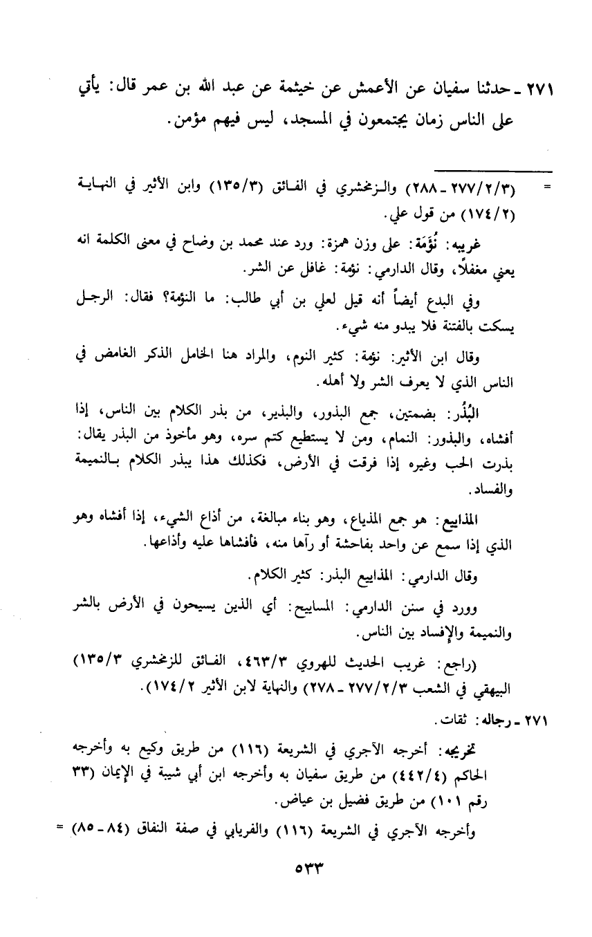 271 - حَدَّثَنَا سُفْيَانُ، عَنِ الْأَعْمَشِ، عَنْ خَيْثَمَةَ، عَنْ عَبْدِ اللَّهِ بْنِ عُمَرَ قَالَ: «§يَأْتِي عَلَى النَّاسِ زَمَانٌ يَجْتَمِعُونَ فِي الْمَسْجِدِ، لَيْسَ فِيهِمْ مُؤْمِنٌ»