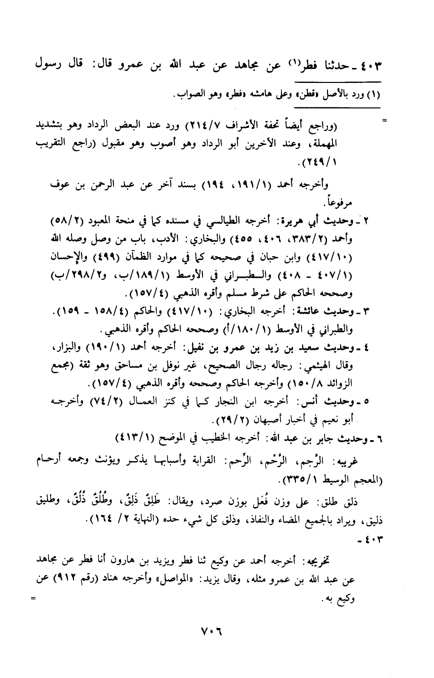 403 - حَدَّثَنَا فِطْرٌ، عَنْ مُجَاهِدٍ، عَنْ عَبْدِ اللَّهِ بْنِ عَمْرٍو قَالَ: قَالَ رَسُولُ -[707]- اللَّهِ صَلَّى اللهُ عَلَيْهِ وَسَلَّمَ: «§إِنَّ الرَّحِمَ لَمُعَلَّقَةٌ بِالْعَرْشِ، وَلَيْسَ الْوَاصِلُ بِالْمُكَافِئِ، وَلَكِنَّ الْوَاصِلَ مَنْ إِذَا قُطِعَتْ رَحِمُهُ وَصَلَهَا»