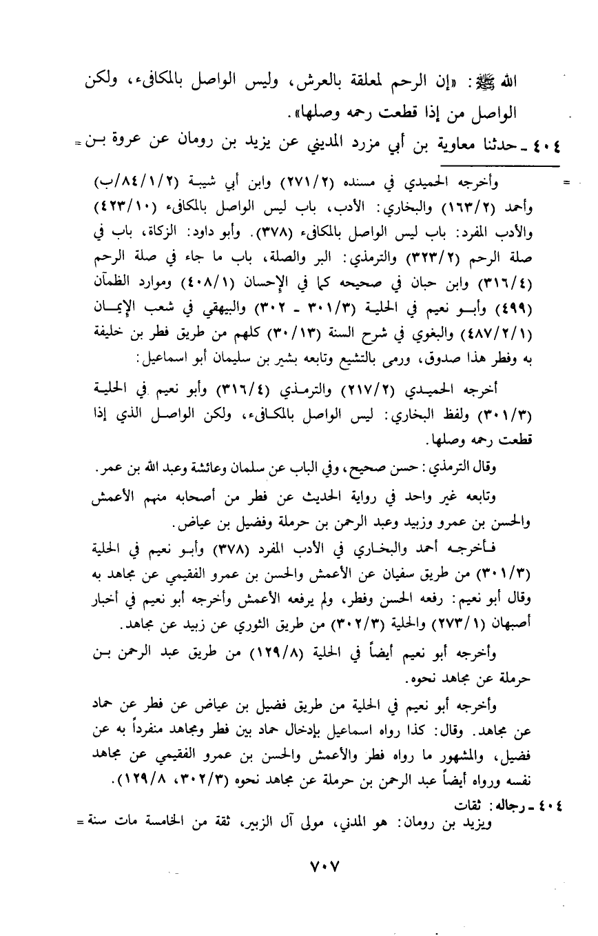 404 - حَدَّثَنَا مُعَاوِيَةُ بْنُ أَبِي مُزَرِّدٍ الْمَدِينِيُّ، عَنْ يَزِيدَ بْنِ رُومَانَ، عَنْ عُرْوَةَ بْنِ -[708]- الزُّبَيْرِ، عَنْ عَائِشَةَ قَالَتْ: قَالَ رَسُولُ اللَّهِ صَلَّى اللهُ عَلَيْهِ وَسَلَّمَ: " §الرَّحِمُ مُعَلَّقَةٌ بِالْعَرْشِ، تَقُولُ: مَنْ وَصَلَنِي وَصَلَهُ اللَّهُ، وَمَنْ قَطَعَنِي قَطَعَهُ اللَّهُ "