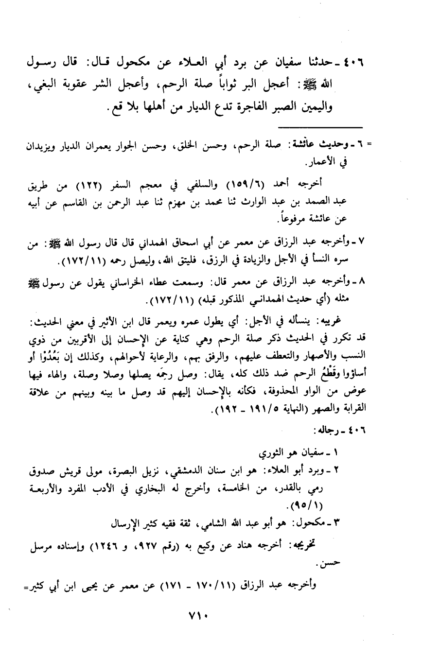 406 - حَدَّثَنَا سُفْيَانُ، عَنْ بُرْدٍ أَبِي الْعَلَاءِ، عَنْ مَكْحُولٍ قَالَ: قَالَ رَسُولُ اللَّهِ صَلَّى اللهُ عَلَيْهِ وَسَلَّمَ: «§أَعْجَلُ الْبِرِّ ثَوَابًا صِلَةُ الرَّحِمِ، وَأَعْجَلُ الشَّرِّ عُقُوبَةً الْبَغْيُ، وَالْيَمِينُ الصَّبْرُ الْفَاجِرَةُ تَدَعُ الدِّيَارَ مِنْ أَهْلِهَا بَلَاقِعَ»