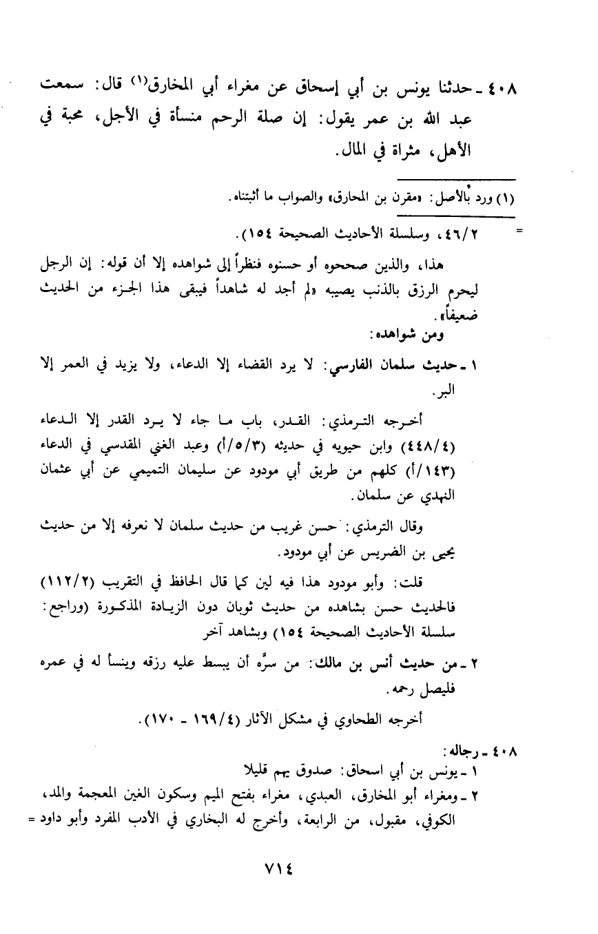 408 - حَدَّثَنَا يُونُسُ بْنُ أَبِي إِسْحَاقَ، عَنْ مَغْرَاءَ أَبِي الْمَخَارِقِ قَالَ: سَمِعْتُ عَبْدَ اللَّهِ بْنَ عُمَرَ يَقُولُ: «§إِنَّ صِلَةَ الرَّحِمِ مَنْسَأَةٌ فِي الْأَجَلِ، مَحَبَّةٌ فِي الْأَهْلِ، مَثْرَاةٌ فِي الْمَالِ»