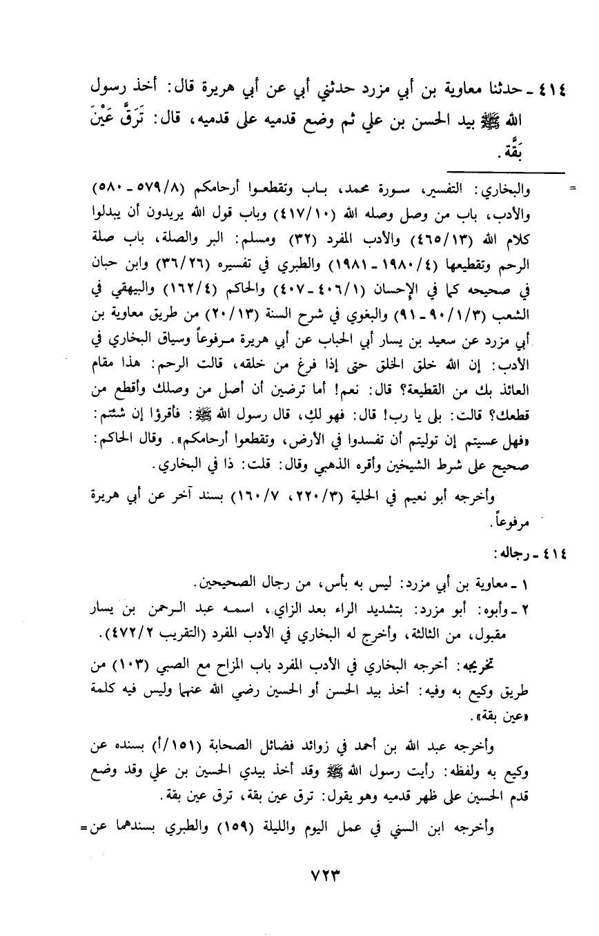 414 - حَدَّثَنَا مُعَاوِيَةُ بْنُ أَبِي مُزَرِّدٍ، حَدَّثَنِي أُبَيٌّ، عَنْ أَبِي هُرَيْرَةَ قَالَ: أَخَذَ رَسُولُ اللَّهِ صَلَّى اللهُ عَلَيْهِ وَسَلَّمَ بِيَدِ الْحَسَنِ بْنِ عَلِيٍّ ثُمَّ وَضَعَ قَدَمَيْهِ، عَلَى قَدَمَيْهِ، قَالَ: «§تَرَقَّ عَيْنَ بَقَّةٍ»