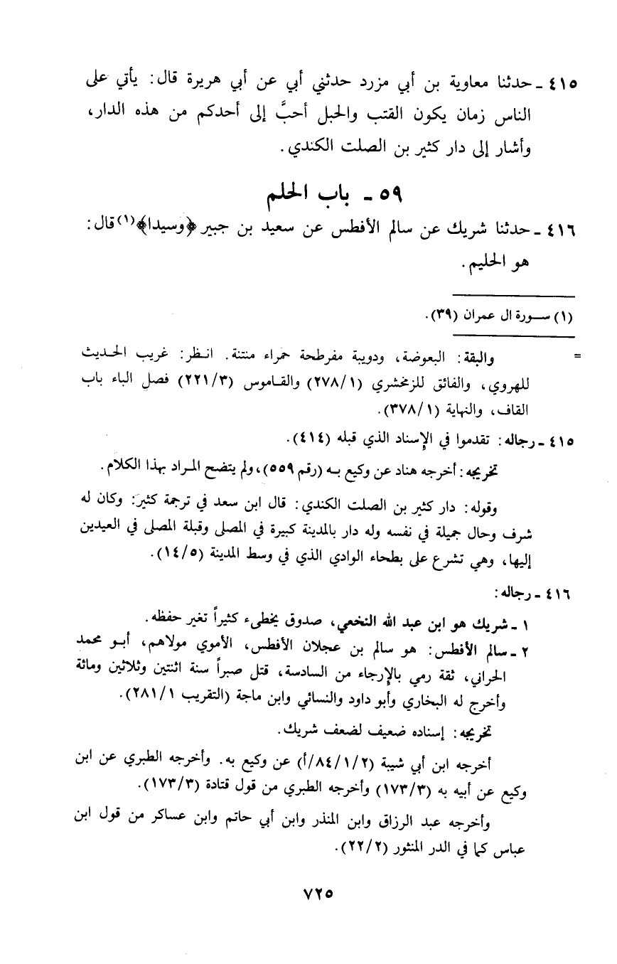 416 - حَدَّثَنَا شَرِيكٌ، عَنْ سَالِمٍ الْأَفْطَسِ، عَنْ سَعِيدِ بْنِ جُبَيْرٍ: {§وَسَيِّدًا} [آل عمران: 39] قَالَ: هُوَ الْحَلِيمُ