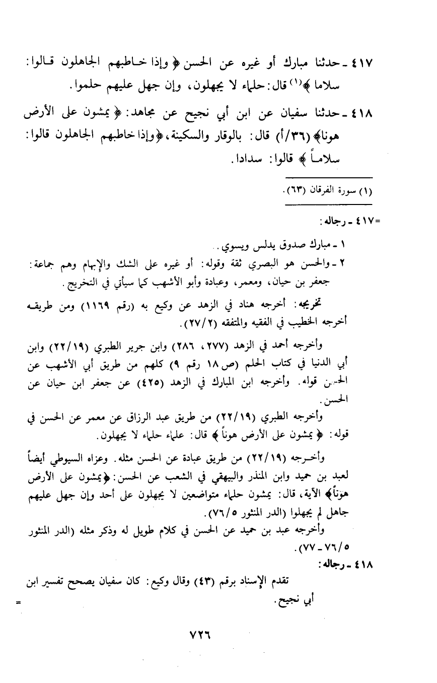 417 - حَدَّثَنَا مُبَارَكٌ أَوْ غَيْرُهُ، عَنِ الْحَسَنِ: {§وَإِذَا خَاطَبَهُمُ الْجَاهِلُونَ قَالُوا سَلَامًا} [الفرقان: 63] قَالَ: «حُلَمَاءُ لَا يَجْهَلُونَ، وَإِنْ جُهِلَ عَلَيْهِمْ حَلُمُوا»