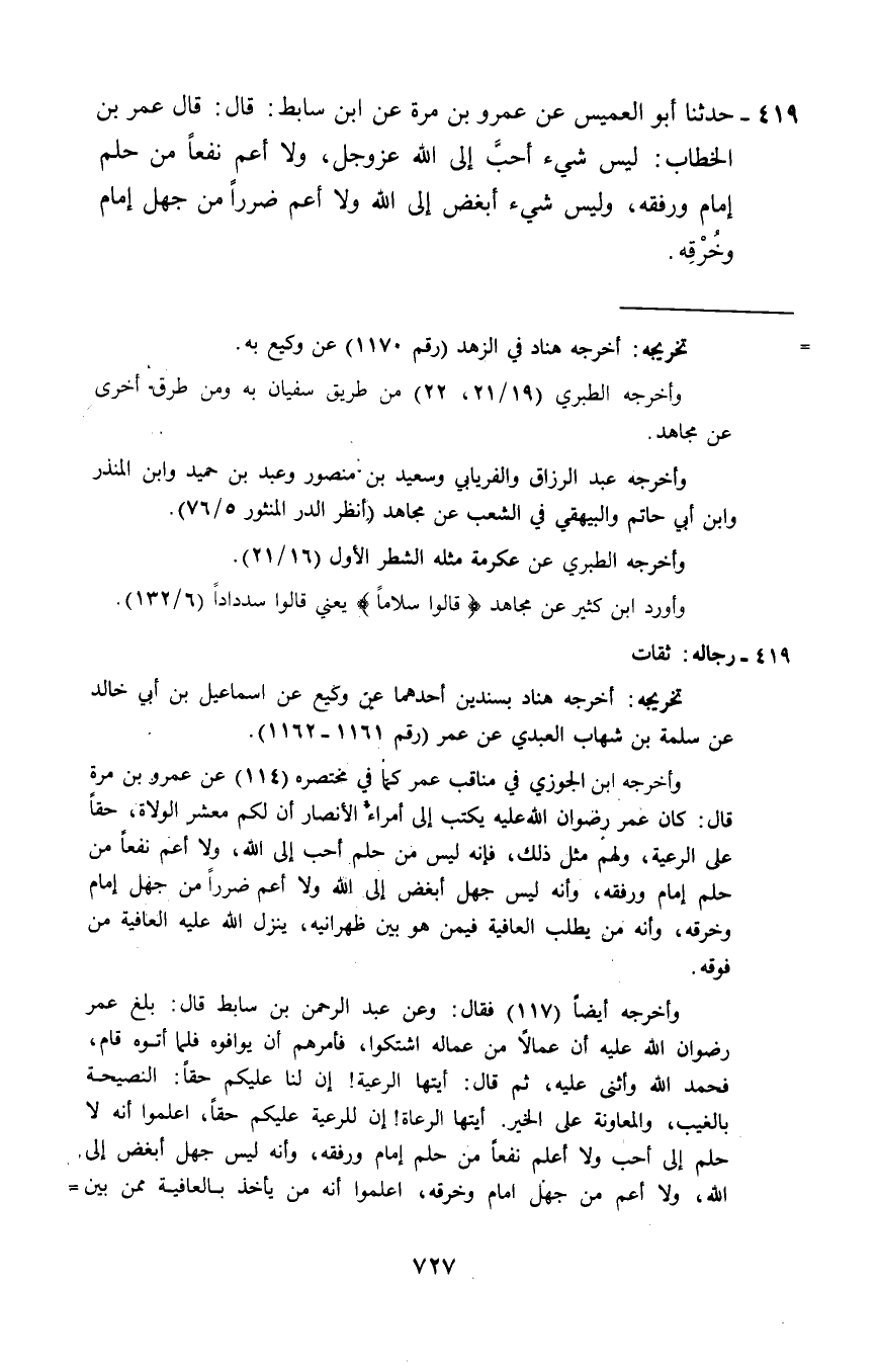 419 - حَدَّثَنَا أَبُو الْعُمَيْسِ، عَنْ عَمْرِو بْنِ مُرَّةَ، عَنِ ابْنِ سَابِطٍ: قَالَ: قَالَ عُمَرُ بْنُ الْخَطَّابِ: «§لَيْسَ شَيْءٌ أَحَبَّ إِلَى اللَّهِ عَزَّ وَجَلَّ، وَلَا أَعَمَّ نَفْعًا مِنْ حِلْمِ إِمَامٍ وَرِفْقِهِ، وَلَيْسَ شَيْءٌ أَبْغَضَ إِلَى اللَّهِ وَلَا أَعَمَّ ضَرَرًا مِنْ جَهْلِ إِمَامٍ وَخُرْقِهِ»