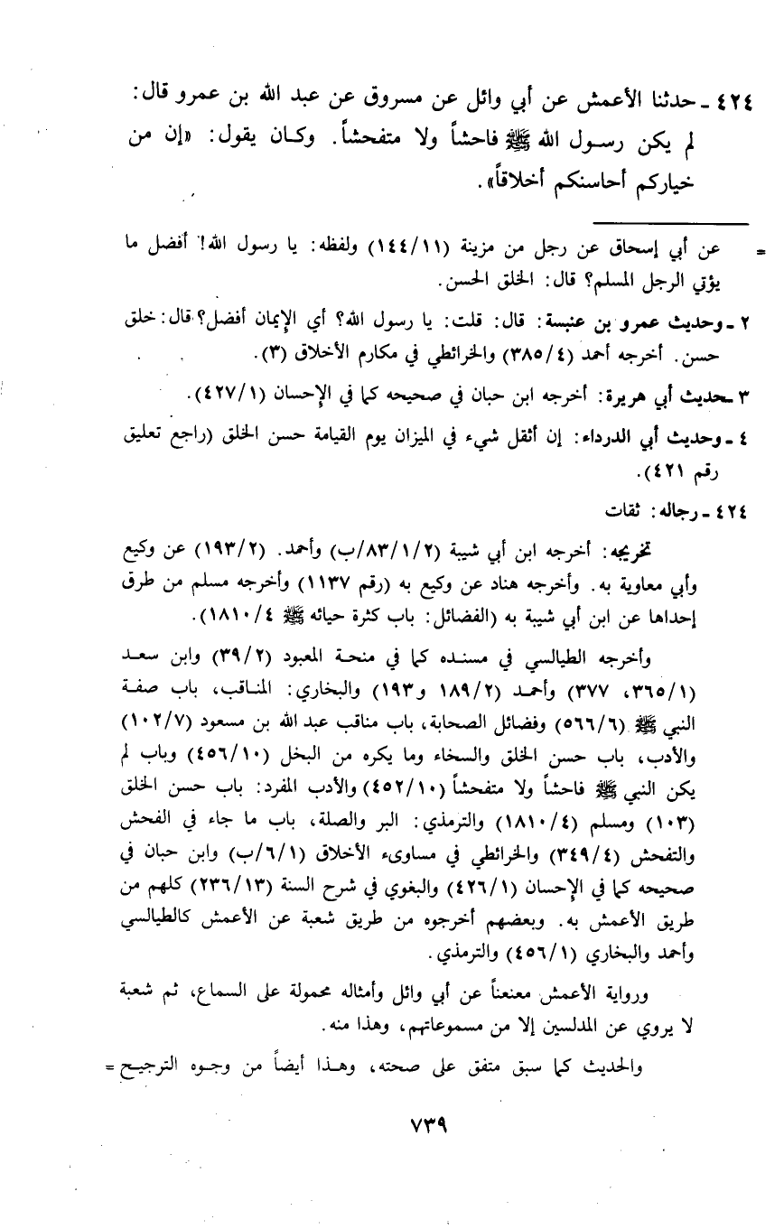 424 - حَدَّثَنَا الْأَعْمَشُ، عَنْ أَبِي وَائِلٍ، عَنْ مَسْرُوقٍ، عَنْ عَبْدِ اللَّهِ بْنِ عَمْرٍو قَالَ: لَمْ يَكُنْ رَسُولُ اللَّهِ صَلَّى اللهُ عَلَيْهِ وَسَلَّمَ فَاحِشًا وَلَا مُتَفَحِّشًا. وَكَانَ يَقُولُ: «§إِنَّ مِنْ خِيَارِكُمْ أَحَاسِنَكُمْ أَخْلَاقًا»