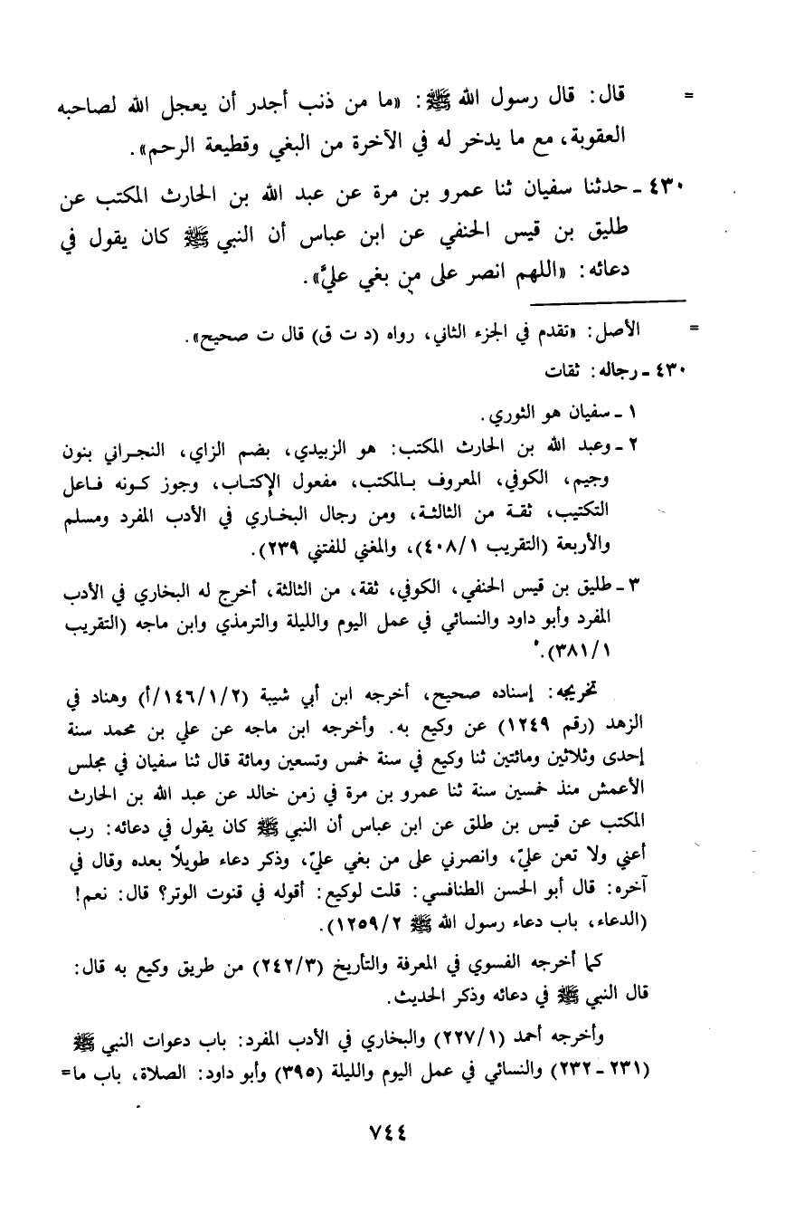 430 - حَدَّثَنَا سُفْيَانُ ثنا عَمْرُو بْنُ مُرَّةَ، عَنْ عَبْدِ اللَّهِ بْنِ الْحَارِثِ الْمُكْتِبِ، عَنْ طَلِيقِ بْنِ قَيْسٍ الْحَنَفِيِّ، عَنِ ابْنِ عَبَّاسٍ أَنَّ النَّبِيَّ صَلَّى اللهُ عَلَيْهِ وَسَلَّمَ §كَانَ يَقُولُ فِي دُعَائِهِ: «اللَّهُمَّ انْصُرْنِي عَلَى مَنْ بَغَى عَلَيَّ»