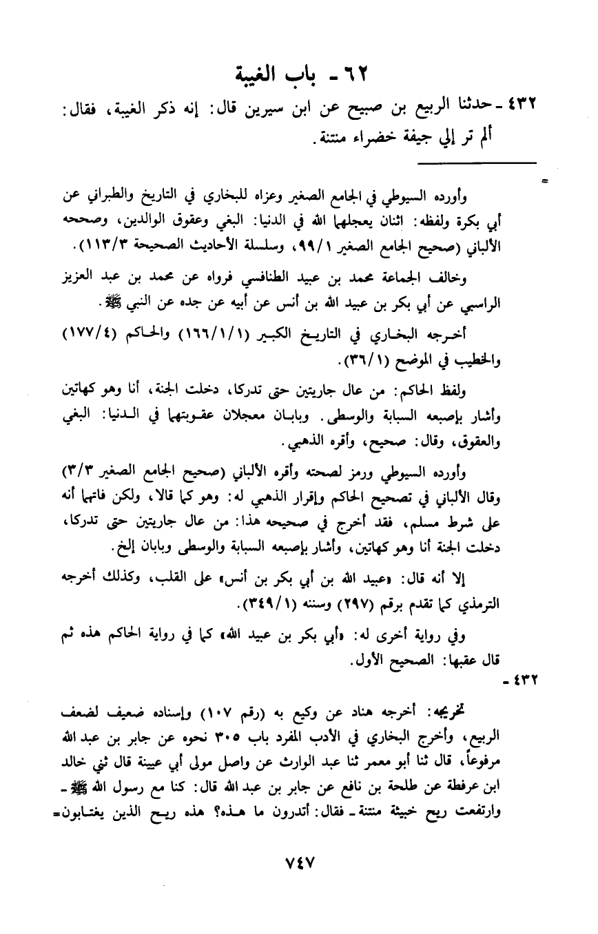 432 - حَدَّثَنَا الرَّبِيعُ بْنُ صُبَيْحٍ، عَنِ ابْنِ سِيرِينَ قَالَ: إِنَّهُ §ذَكَرَ الْغِيبَةَ، فَقَالَ: «أَلَمْ تَرَ إِلَى جِيفَةٍ خَضْرَاءَ مُنْتِنَةٍ»