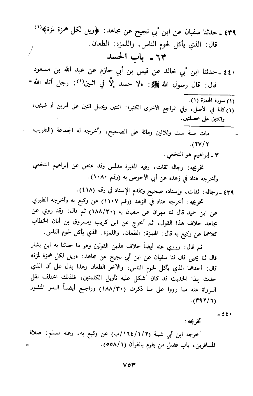 439 - حَدَّثَنَا سُفْيَانُ، عَنِ ابْنِ أَبِي نَجِيحٍ، عَنْ مُجَاهِدٍ: {§وَيْلٌ لِكُلِّ هُمَزَةٍ لُمَزَةٍ} [الهمزة: 1] قَالَ: الَّذِي يَأْكُلُ لُحُومَ النَّاسِ، وَاللُّمَزَةُ: الطَّعَّانُ "